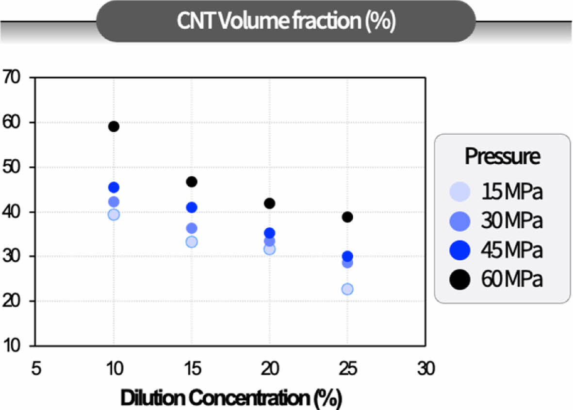 (1) HACNT 나노복합재의 CNT 부피분율은 희석비율이 감소하고 압력이 증가함에 따라 증가하는 경향을 보였다.