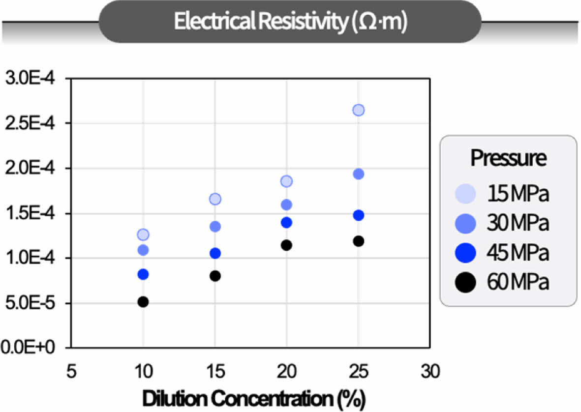 HACNT 나노복합재의 전기 저항(Resistivity)을 에폭시의 희석비율과 프레스 압력에 따라 측정하였다. Fig. 7에 따르면, HACNT 나노복합재의 전기 저항은 희석비율이 감소함에 따라 감소하는 경향을 보였다. 구체적으로 전기 저항은 희석비율이 가장 낮은 10%에서 약 0.5E-4 Ω·m로 가장 낮았다. 이는 낮은 희석비율에서는 CNT가 효과적으로 밀집되어 CNT 사이의 전기 전도 경로가 효과적으로 잘 형성되었기 때문이다. 이와 더불어, 프레스 압력이 증가함에 따라 전기 저항이 감소하는 경향을 보였다. 이는 고압의 프레스 압력에서 CNT 사이의 갭을 줄여서 복합재 내부의 CNT 밀도를 향상시키고, 이로 인해 CNT 간의 전기적 연결을 효과적으로 강화한 결과로 해석된다.