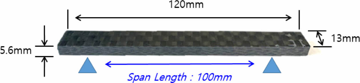 샤르피 3점 굽힘시험을 수행하여 시편의 손상정도와 잔류 굽힘강도 특성을 살펴보기 위하여 복합재 빔 형태의 시편을 제작하였다. Fig. 1은 시편의 형상을 나타낸 그림으로 시편의 치수는 120 mm × 13 mm × 5.6 mm이고 Span Length는 100 mm이다.