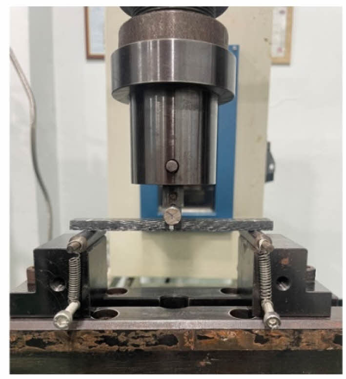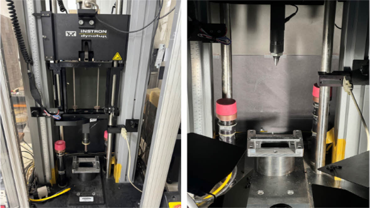 Fig. 5는 충격시험 모습을 나타낸 사진으로, Instron사의 dynatup 충격시험기를 사용하였다. 복합재 시험편의 충격흡수능력을 평가하기 위하여 15J의 에너지를 가하였으며, 질량이 6.67 kg인 충격자를 수직으로 낙하시켜 2.12 m/s의 속도로 충격시험을 수행하였다.