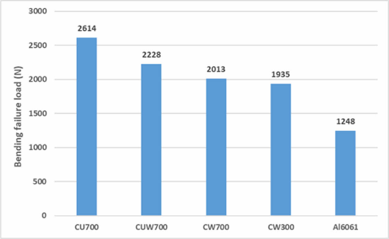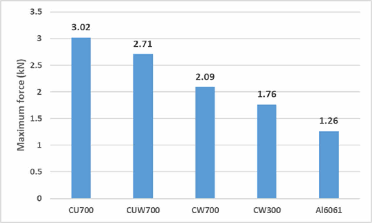Fig. 8은 충격하중 시의 최대하중을 비교한 그래프로서, T700 일방향 섬유 복합재(CU700)의 최대하중이 가장 높은 값을 가지며, 알루미늄의 최대하중이 가장 낮은 값을 보여 흡수에너지와는 다른 경향을 나타내었다. 이는 복합재는 최대하중 이후 하중이 급격히 감소하는 반면, 금속은 넓은 소성 영역을 가지고 있기 때문으로 판단된다. 또한, 일방향 섬유 복합재(CU700)의 최대하중은 패브릭 복합재(CW700)보다 약 44.3% 높은 값을 보이나, 흡수에너지는 상대적으로 낮은 증가폭(약 10.2%)을 보였다. 이는 충격하중 시 일방향 섬유 복합재 시편의 변형율이 패브릭 복합재 시편보다 낮은 값을 가지기 때문으로 사료된다. 또한 충격하중 시의 최대하중은 Fig. 4의 정적 굽힘 파손하중과 매우 유사한 경향을 보이며, 정적 굽힘 파손하중보다 높은 값을 나타냄을 볼 수 있다.