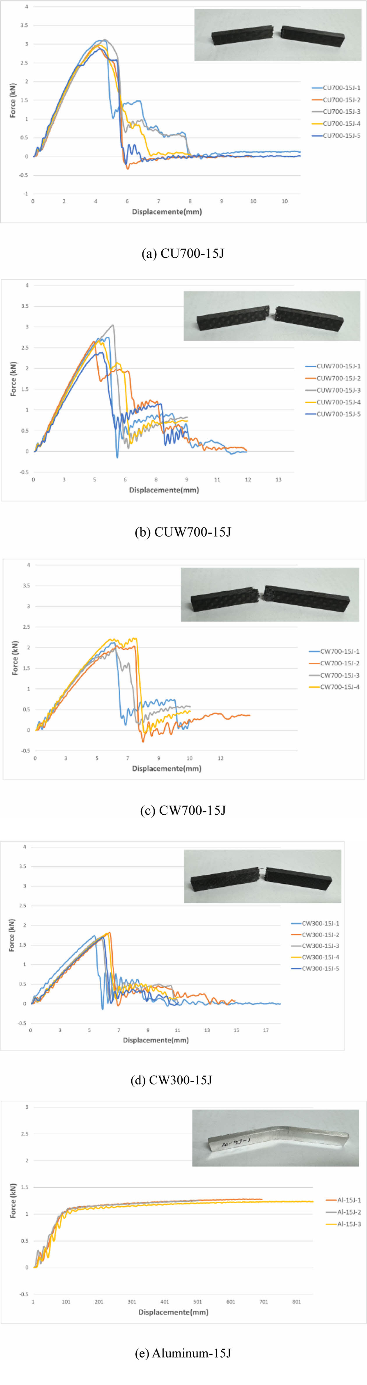 Fig. 6은 15J의 충격시험에서 측정한 하중-변위 그래프와 결과와 파손 형상을 나타낸 사진이다. 그림에서 보는 바와 같이, 충격시험 후 복합재는 중앙부위가 모두 파단된 모습을 볼 수 있으나 알루미늄은 파단은 되지 않고 잔류변형이 발생된 모습을 볼 수 있다.