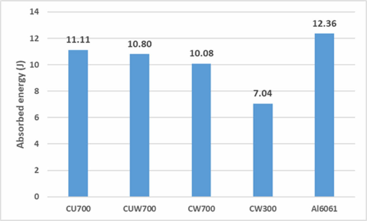 Fig. 7은 시편의 흡수에너지를 나타낸 그래프로, 흡수된 에너지는 하중-변위 선도에서 면적을 합산하여 평가하였다. 그림에서 보는 바와 같이 Al 6061 소재의 흡수에너지가 가장 높게 나타났고, 패브릭 복합재(CW700)보다 일방향 섬유 복합재(CU700)의 흡수에너지가 약 10.2% 증가되었음을 볼 수 있다.