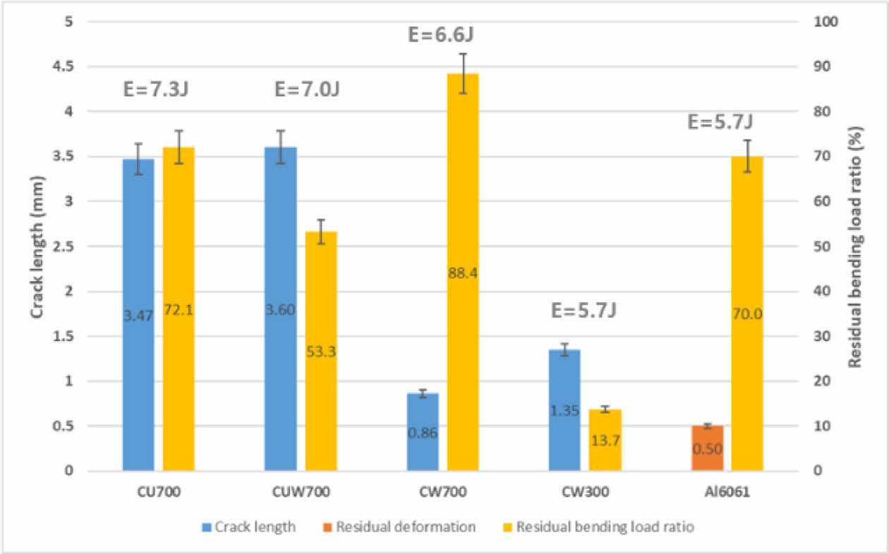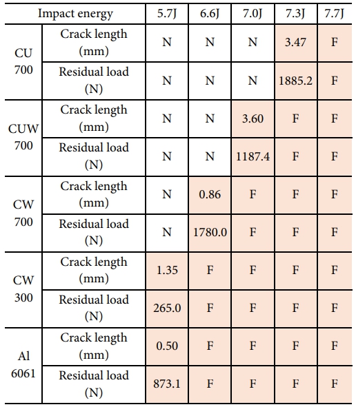 충격하중 하에서 파손이 발생하는 최소 충격에너지를 평가하기 위하여, 충격에너지를 상승시켜가며 시편의 파손여부를 평가하였다. 시편의 파손여부는 침투탐상법에 의한 균열길이 측정과 잔여 굽힘하중 평가를 통하여 판정하였다. Fig. 9(a)는 침투탐상시험을 위해 전용 용액을 분사한 사진이고 Fig. 9(b)의 경우 균열길이를 측정한 사진으로, CU700 시편에 7.3J의 충격에너지를 가했을 때 약 3.47 mm의 균열이 측정되었다. Table 3은 각 시편에 충격에너지를 증가시켜 가며 균열길이와 잔여 굽힘하중을 평가한 결과이다. 잔여 굽힘하중을 정적 굽힘 파손하중으로 나눈 값을 잔여 하중비로 정의하여 Fig. 10에 나타내었다. Table 3과 Fig. 10에서 보는 바와 같이, CU700은 7.3J, CUW700은 7J, CW700은 6.6J, CW300과 Al6061은 5.7J에서 균열과 잔류 굽힘하중 저하가 발생하여 파손이 발생되었음을 확인할 수 있다.