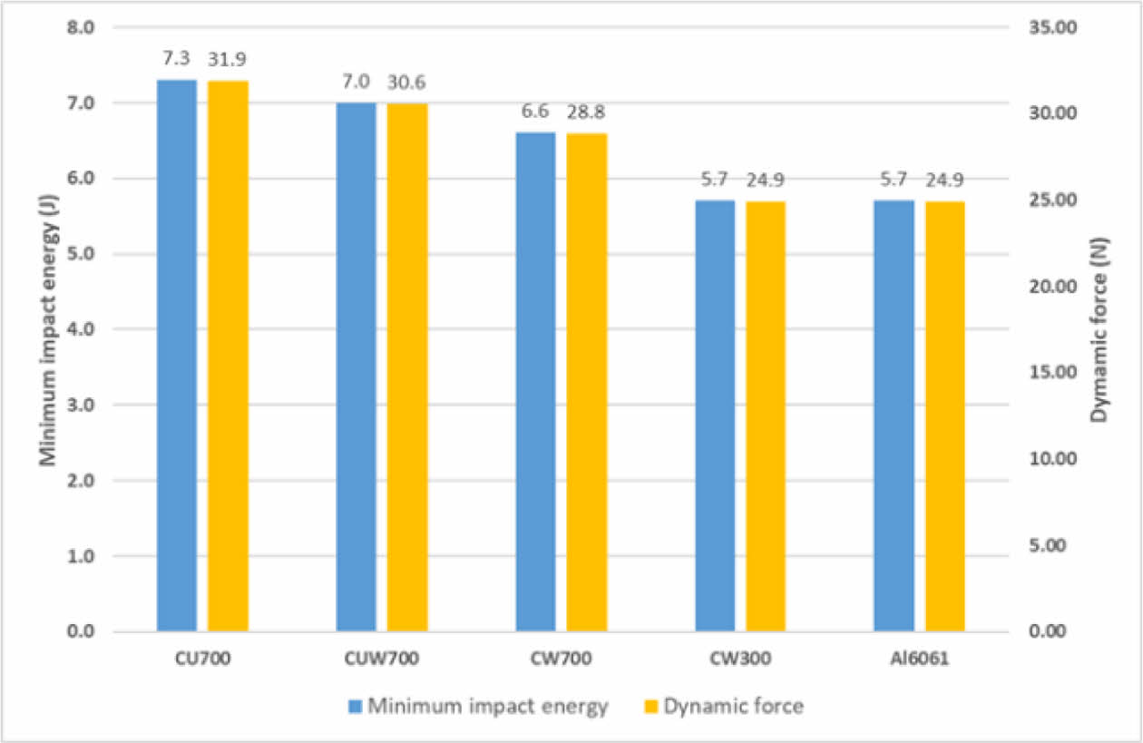 이상의 결과를 종합하여, 파손이 발생하는 최소 충격에너지를 나타내면 Fig. 11과 같다. Fig. 11에서 보는 바와 같이, 파손이 발생하는 최소 충격에너지는 패브릭 복합재(CW700)보다 일방향 섬유 복합재(CU700)의 최소 충격에너지가 약 10.6% 증가되었음을 볼 수 있으며, 이는 Fig. 7의 흡수에너지 증가 (10.2%)와 매우 유사한 경향을 나타내었다. 그러나 Al6061 금속소재의 최소 충격에너지는 복합재보다 낮은 값을 보여 흡수에너지와의 유사성이 부족한 것으로 나타났다.