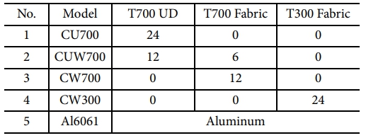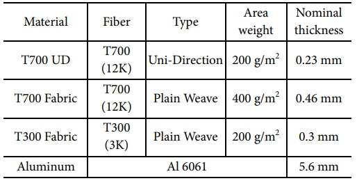 시편 제작에 사용된 소재는 T700 일방향 섬유, T700 패브릭, T300 패브릭, 알루미늄 등으로, 각 소재의 특성은 Table 1에 정리되어 있다.