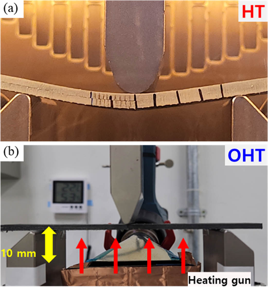 온도 조건은 상온 조건(Room temperature, RT)과 고온 조건을 설정하였다. 고온 조건의 경우 극한 환경에서 항공용 부품으로 활용되었을 때 노출될 수 있는 높은 온도를 부여하기 위하여 초음속 비행기가 운행 시 동체에 가해질 수 있는 온도인 130oC를 목표 온도로 설정하였다[17]. 또한 모든 면에 열을 가하는 Chamber heating(HT) 조건과 히팅 건을 통해 한쪽 면에만 열을 가하는 One-side heating(OHT) 조건 총 두가지로 진행하였다. HT 조건은 130oC 온도의 챔버 환경에서 시편의 온도가 목표온도에 도달하는 시점부터 시험을 진행하였다(Fig. 2a). OHT 조건은 굽힘을 통해 CFRP가 열원과 가까워지는 것을 고려하여 10 mm 간격을 두고 열을 가해주었다(Fig. 2b). OHT 조건의 경우 주변 온도 분위기가 상온이기 때문에 열 손실이 발생하여 더 고온의 열원 조건을 설정해 주었다. 이는 얇은 두께의 CFRP는 160oC, 두꺼운 두께의 CFRP는 170oC의 열원 조건을 필요로 하였다. OHT 조건 역시 시편이 목표 온도에 도달한 시점부터 시험을 진행하였으며, 온도는 시편 위아래에 온도 센서를 부착하여 측정하였다.