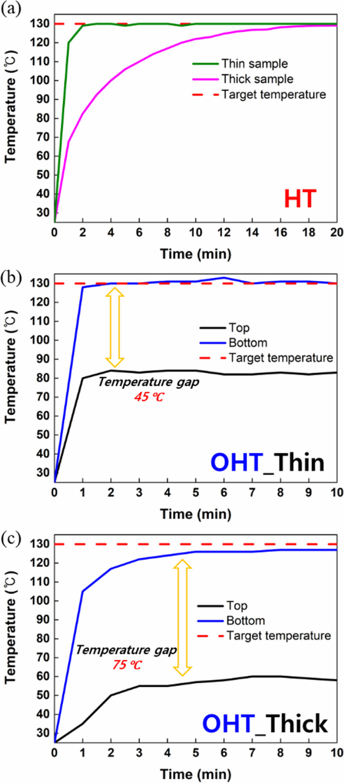 Fig. 3 Temperature-time curve; (a) thin and thick specimens under chamber heating condition, (b) thin specimen under one-side heating condition, (c) thick specimen under one-side heating condition |