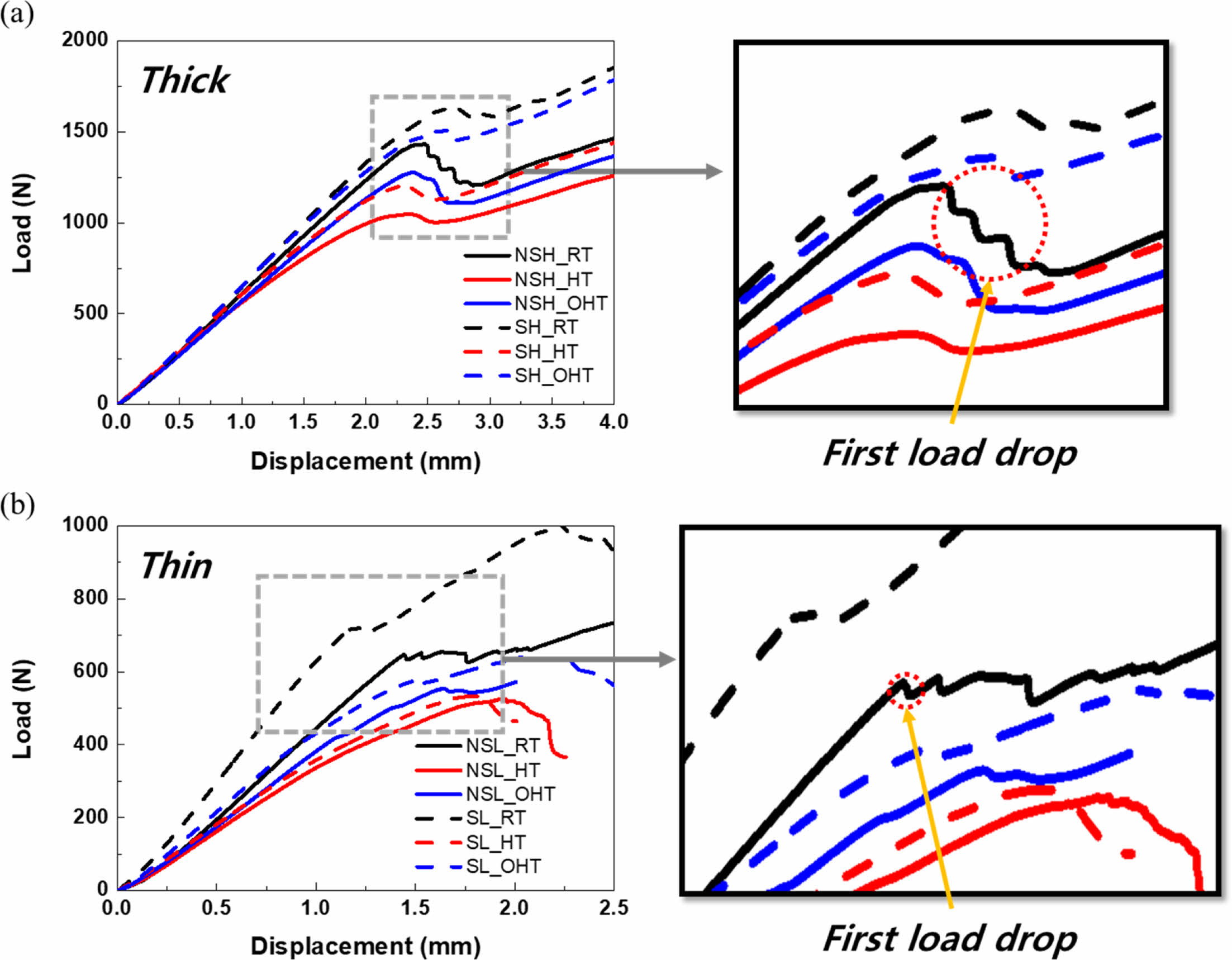 두께 및 온도와 스티칭 여부에 따른 CFRP의 Mode II 시험 결과 하중-변위 곡선과(Fig. 4), 최대 하중 및 탄성률을 비교하였다(Fig. 5). Fig. 4의 경우 하중 롤러의 변위가 증가하면서 변화하는 하중 값을 나타내며 스티칭 된 CFRP는 점선으로, 비 스티칭 CFRP는 실선으로 표현했다. Fig. 4a의 두꺼운 두께 CFRP의 경우 탄성 거동을 보이다가 첫 번째 하중 감소가 일어나는데, 이 시점에서 박리가 성장함을 나타낸다. 모든 온도 조건의 탄성 구간에서 스티칭 된 CFRP가 비 스티칭 CFRP 대비 높은 하중 값을 가지는 것을 확인할 수 있었다. RT 조건 기준 NSH는 1,432 N, SH는 1,625 N으로 약 13.5% 가량 상승하였으며 HT 조건에서 NSH는 1,046 N, SH는 1,203 N으로 약 15%가 증가한 임계 하중 값을, OHT의 경우 NSH가 1,276 N, SH가 1,508 N으로 약 18.2%가 증가한 임계 하중 값 상승 효과를 보였다. 탄성률 또한 비교하였으며, 굽힘 탄성률은 식 (1)을 이용하여 계산하였다.