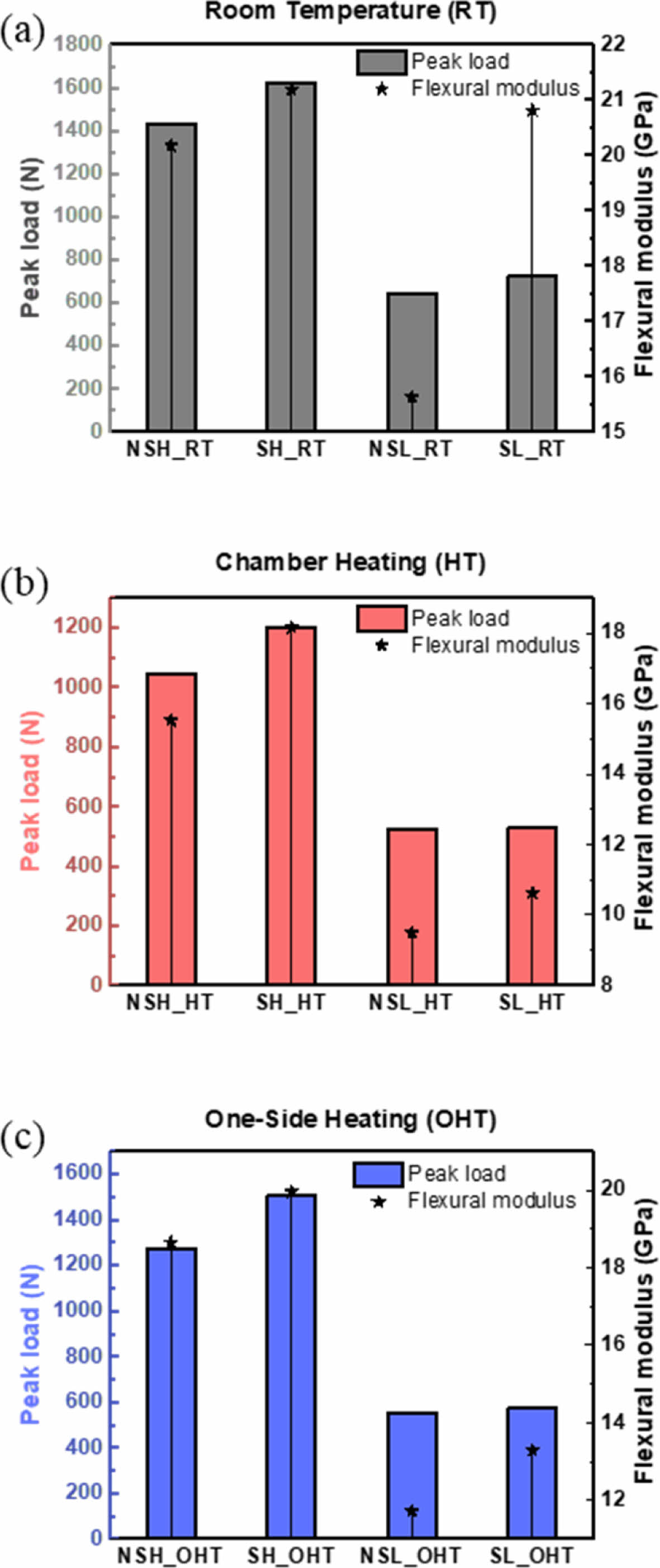 Fig. 5 The mode II test results of peak load and flexural modulus; (a) under RT condition, (b) under HT condition, (c) under OHT condition |