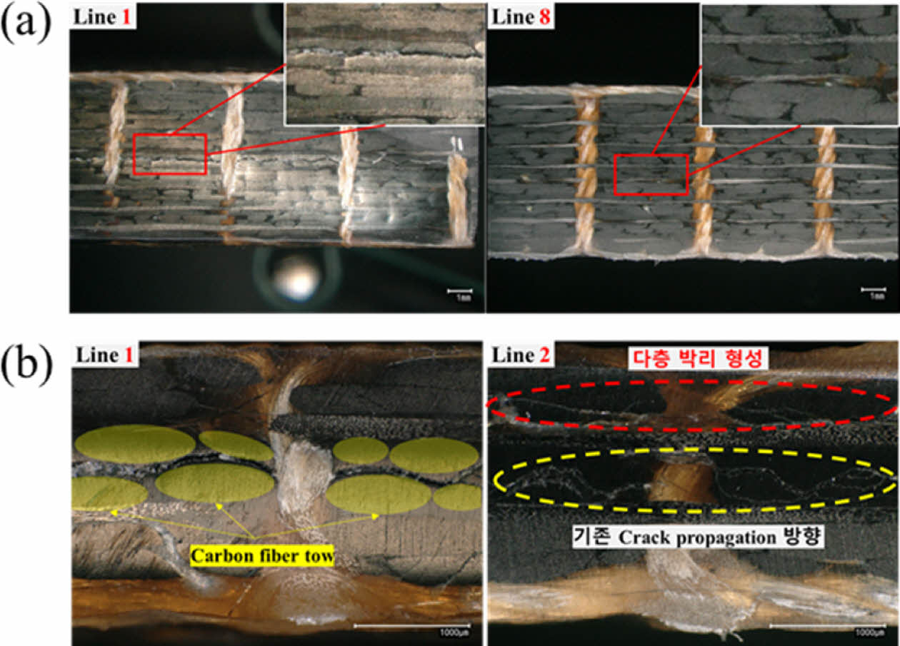 Mode II 시험이 완료된 후 박리 거동을 관찰하기 위해 시험 후 RT 조건의 SH와 SL 시편의 두께 방향 단면을 촬영하였다(Fig. 6). SH 시편의 경우 첫 번째 라인과 여덟 번째 라인의 이미지를 관찰하였으며, SL 시편은 첫 번째 라인과 두 번째 라인의 이미지를 관찰하였다. 공통적으로 CFRP의 두께에 상관없이 모든 라인에서 스티칭 원사가 끊어지지 않고 유지되고 있는 것을 확인하였다. 이는 시험 후 박리가 성장하는 CFRP에 스티칭 원사가 지속적으로 박리에 대해 저항할 수 있음을 나타낸다. 또한 중앙의 예비 균열을 따라 tow와 tow 사이 레진 영역에서 지속적으로 박리가 성장했음을 보여주며, 이는 예상된 CFRP의 박리 거동과 동일하게 나타났다[21]. SH의 경우 모든 스티칭 라인을 지나면서 단층 박리가 형성된 모습을 볼 수 있다(Fig. 6a). 그러나 SL의 경우 두 번째 라인부터 기존 예비 균열에서 벗어난 다층 박리가 발생한 것을 관찰하였다. 이러한 이유로는 두꺼운 두께의 CFRP 대비 가해지는 하중 값이 낮은 얇은 두께의 CFRP는 박리 힘 또한 낮기 때문에 스티칭 원사에 의해 박리의 진행방향이 더욱 크게 저항을 받게 되면서 스티칭 라인을 따라 변경되며 새롭게 박리가 형성되는 다층 박리가 나타난 것으로 사료된다(Fig. 6b). 또한, 구조적인 차이로 인해 얇은 두께의 CFRP는 Mode II 하중에 대해 더 큰 휘어짐이 발생하게 되고 국부적인 응력집중이 두꺼운 시편 대비 보다 크게 나타나며 불규칙적인 박리 성장에 더욱 영향을 받게 된다. 결과적으로 스티칭이 적용된 CFRP에서 두께에 따른 박리 거동의 차이를 관찰하였다.