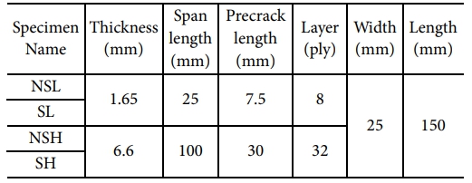 CFRP 제작에 있어서 사용한 탄소섬유는 ±45 non-crimp 원단(Class 75 DMS2436, Jaco Aerospace & Industrial)을 채택하였으며, 기지재는 epoxy resin(API 1078, Applied Poleramic Inc.)을 사용하였다. 스티칭에 사용된 원사는 고온 환경에서 노출될 것을 고려하여 이에 적합한 낮은 열 팽창계수, 강한 인장 강도와 탄성률 및 화학적 안정성을 지니는 Kuraray사의 vectran filament yarn 1,200D를 사용하였다[15]. 모든 시편은 내부 예비 균열을 형성하기 위해 적층 과정에서 중간층에 teflon film을 삽입하였다. 또한 두께 증가 효과를 관찰하기 위해 얇은 두께(Low thickness)와 두꺼운 두께(High thickness) 시편을 제작하였다. 얇은 두께 시편의 경우 [-45/45/90/0]s의 적층 패턴을, 두꺼운 두께 시편의 경우 얇은 두께 시편 대비 4배의 스케일을 부여하여 [-45/45/90/0]4s의 적층 패턴을 설계하였다. 스티칭의 효과를 비교하기 위해서 두께별로 스티칭(Stitching)/비 스티칭(Non-stitching) 두가지 비교 시편을 제작하였으며, 결과적으로 총 4개의 비교군(SL/NSL/SH/NSH)을 설정하였다(Fig. 1). 스티칭 라인 역시 동일한 스케일을 부여하여 얇은 시편의 경우 2 스티칭 라인을, 두꺼운 시편의 경우 8 스티칭 라인을 설계하였다. 제작된 시편의 이름과 치수는 Table 1에 나타냈다. 스티칭 장비는 Ferdco Juki Pro 2000h stitching machine을 이용하여 프리폼을 제작하였고, VARTM 방식을 통해 180oC에서 2시간 동안 경화를 진행하였다. 성형이 완료된 시편은 워터젯(SJA-T500, HyperJet 94i-S 고압 시스템, TOPS)을 사용하여 알맞은 크기로 제작하였다.
