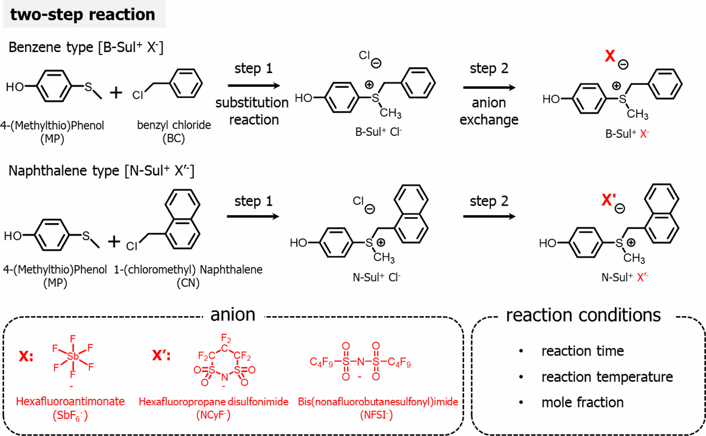 다음으로, anion exchange reaction을 통해 B-Sul+SbF6−, N-Sul+NCyF−, N-Sul+NFSI− 총 3개의 sulfonium 기반 양이온 경화제를 합성하였다. Round bottom flask에서 B-Sul+Cl− 또는 N-Sul+Cl− (75.0 mmol)을 40 ml의 혼합 용매 (distilled water: ethyl acetate = 3:2 vol%)에 완전히 용해시켰다. 이후, 음이온 salt (NaSbF6, LiNCyF, LiNFSI, 9.00 mmol)을 천천히 추가한 뒤, 35°C 및 하루 동안 질소 분위기 하에서 교반하였다. 반응이 완료된 후, distilled water와 ethyl acetate (1:1 vol%)를 사용하여, 세번 추출하였고 MgSO4를 사용하여 distilled water을 완전히 제거하였다. 마지막으로, 회전 증발기를 이용해 ethyl acetate 증발시킨 후, 하루 동안 진공 건조하여 액체 상태의 최종 생성물을 얻었다. 본 연구에서는 반응 조건을 최적화하여 수율 및 순도를 극대화하기 위해, substitution reaction 및 anion exchange reaction에 대한 반응 시간, 온도 및 반응물의 비율이 조절되었다.