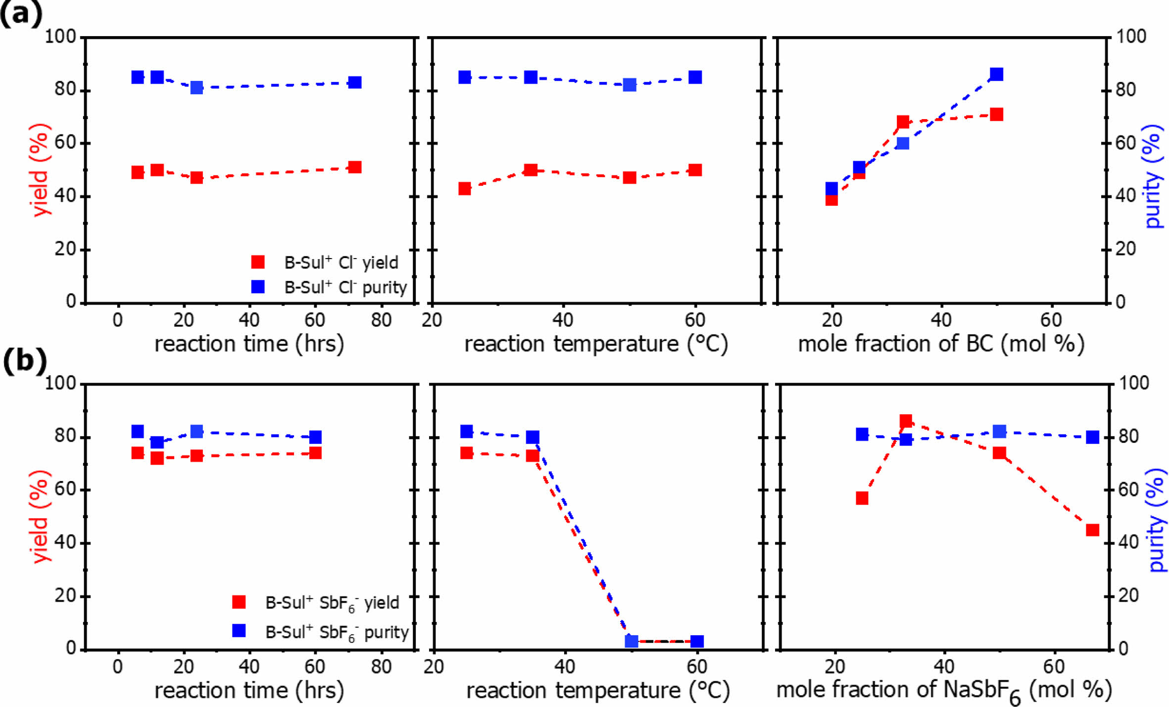 Fig. 2 Yield and purity results of benzyl-type sulfonium curing agents under various reaction conditions: (a) B-Sul+Cl− , (b) B-Sul+SbF6− |