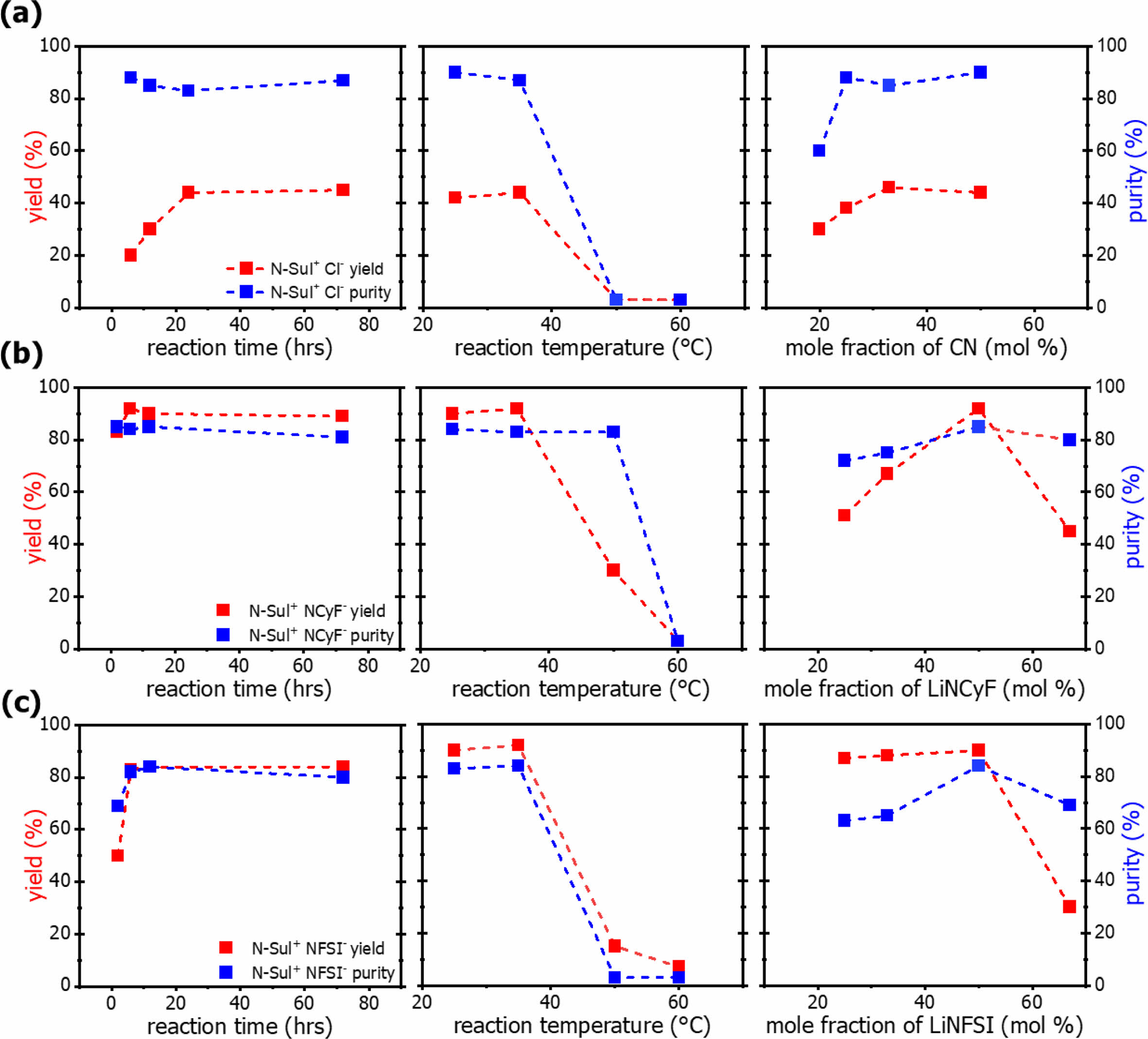 Fig. 3 Yield and purity results of naphthyl-type sulfonium curing agents under various reaction conditions: (a) N-Sul+Cl− , (b) NSul+NCyF− , (c) N-Sul+NFSI− |