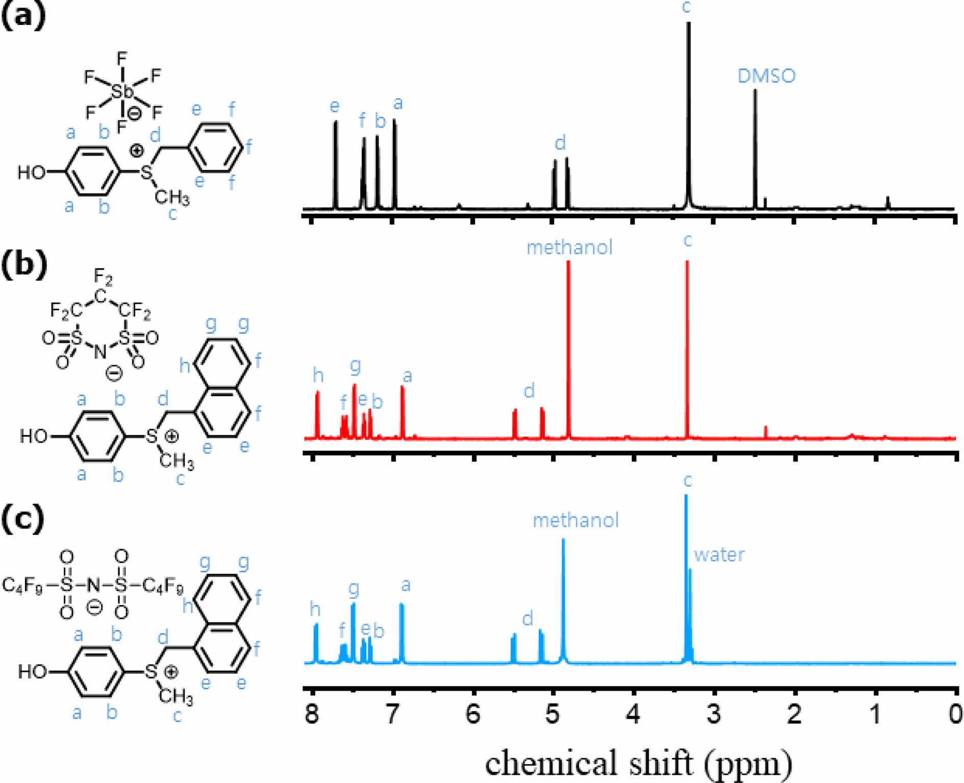 Fig. 4는 위에서 합성된 경화제인 B-Sul+SbF6−, N-Sul+NCyF− 및 N-Sul+NFSI−의 1H NMR spectra를 보여준다 [22]. 세 가지 경화제 모두 각 구조에 해당하는 proton peak의 위치 및 적분 값이 일치하였으며, 추가적인 큰 peak가 관찰되지 않아 미 반응 물질이나 불순물이 남아 있지 않았고 높은 순도로 합성되었음을 보여준다. Benzyl type 및 naphthyl type 경화제의 구조적 차이를 6.86-7.98 ppm 범위의 peak에서 확인할 수 있다. 또한 전자를 끌어당기는 그룹인 anion의 영향으로 인해 sulfonium과 결합된 d 위치의 proton에서 5.1-5.6 ppm 범위의 peak shift가 발생됨을 확인할 수 있다.