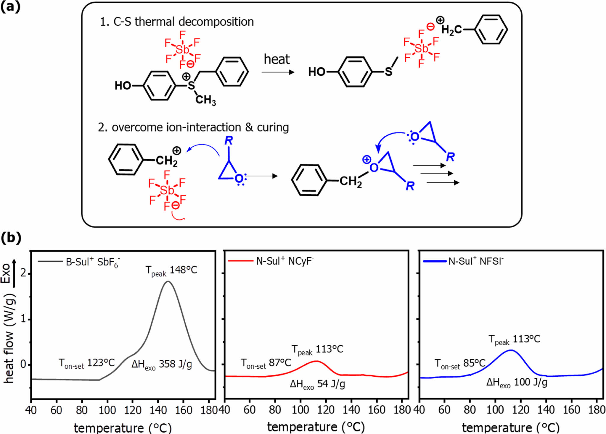 Fig. 5 (a) Curing mechanism of sulfonium curing agents with epoxy resins, and (b) DSC thermograms of one-component epoxies prepared with B-Sul+SbF6− , NSul+NCyF− , and N-Sul+NFSI− curing agents. The one-component epoxies were prepared by mixing YDF-170 epoxy resin with each curing agent in a 10:1 weight ratio |