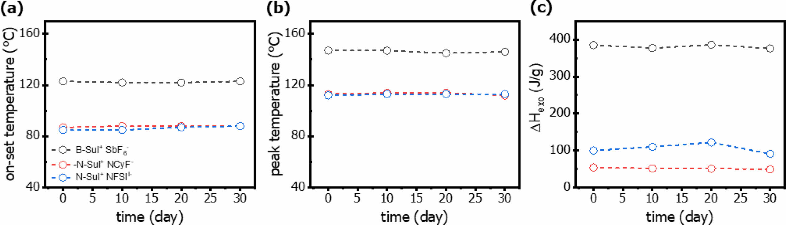 전자 재료용 일액형 에폭시 접착제 시스템에서, 보관 안정성은 매우 중요한 특성이다[6,14]. 합성된 경화제의 보관안정성을 정량적으로 평가하기 위해, 각각 제조된 일액형 에폭시의 시간에 따른 Ton-set, Tp 및 ∆H의 변화를 측정하였다[23,24]. Fig. 6a에서 보이듯이, B-Sul+SbF6−, N-Sul+NCyF− 및 N-Sul+NFSI− 경화제 30일까지 Ton-set이 변하지 않고 일정하게 유지되었다. 또한, Fig. 6b와 6c에서 나타낸 Tp 및 ∆H 역시 시간에 따라 유의미한 변화가 없었으며, 약 10% 이내의 적은 변화폭 만을 보여주었다. 이는 에폭시와 혼합된 후 시간이 지나도 경화제의 경화 성능이 일정하게 유지됨을 의미한다. 결과적으로, 각 경화제가 에폭시와의 반응에서 일관된 경화 거동을 유지하며, 장기간에 걸쳐 균일하고 안정적인 성능을 제공할 수 있음을 보여준다.