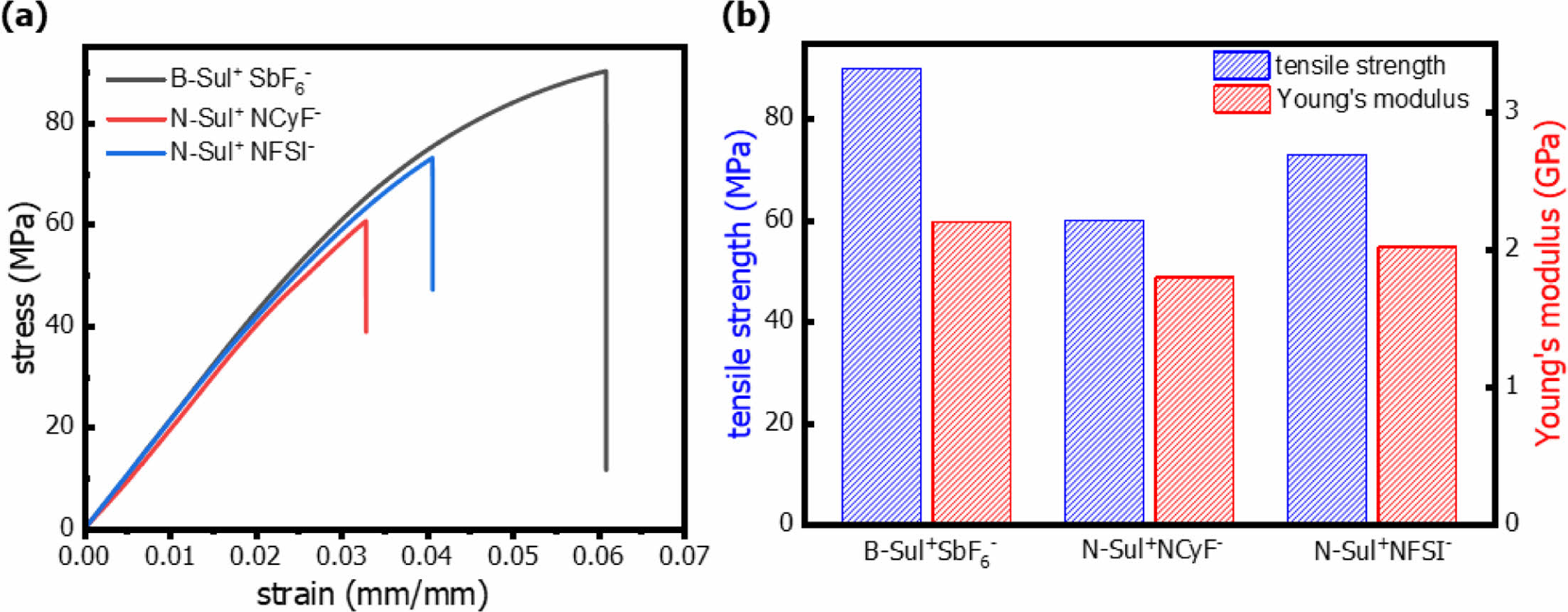 Fig. 7 Mechanical properties of one-component epoxies cured with B-Sul+SbF6− , NSul+NCyF− , and N-Sul+NFSI− curing agents: (a) stress-strain curves, (b) tensile strength (blue) and Young’s modulus (red) |