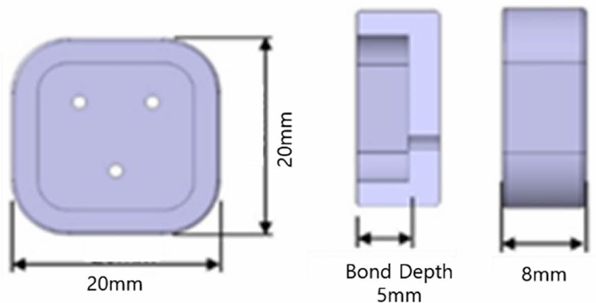 이를 위해 3D 프린터를 이용해 풀 아웃 시편을 제작하였으며, 풀 아웃 시편은 20 mm × 20 mm × 8 mm 크기의 형상으로 되었다. 시편 중앙부에는 깊이 5 mm의 홈이 파져 있으며, 케이블 삽입을 위한 구멍이 바닥면에 3개 뚫려 있다. 이러한 형상은 케이블의 견고한 체결과 접착제의 전단 성능을 정확하게 평가할 수 있도록 하였다. Fig. 1에는 시편 제작을 위한 목업이 나타나 있다.