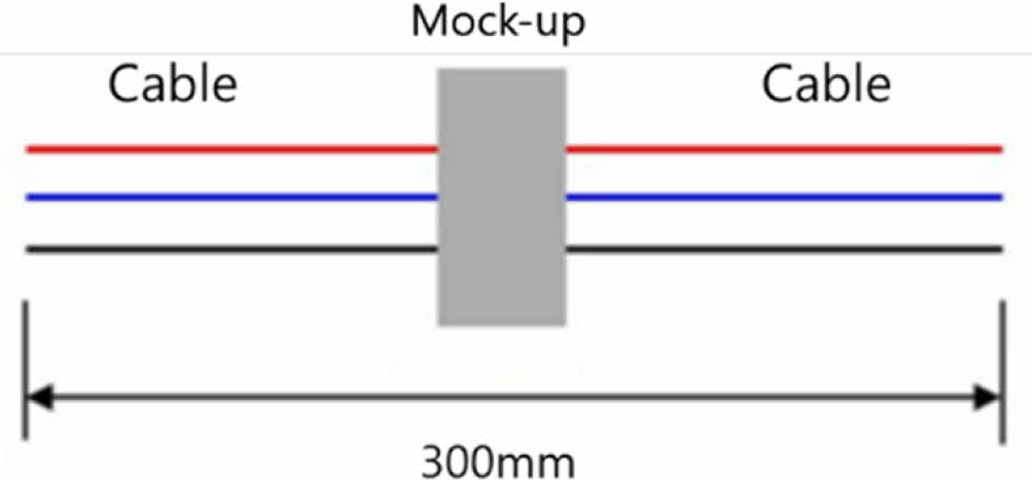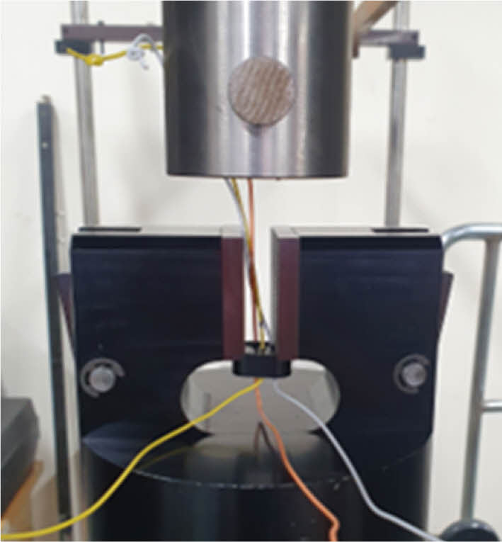 Fig. 2에는 케이블이 장착된 풀 아웃 시편의 형상이 나타나 있다. 접착제의 경화 조건은 접착제 제조사에서 (a) 25oC에서 12시간 이상, (b) 60oC에서 90분, (c) 100oC에서 50분 등의 세 가지를 제시하였다. 본 연구에서는 실제 운용 환경을 고려하여, 25oC에서 12시간 이상인 경화 조건 (a)를 적용하였다. 사용된 케이블의 규격은 24 AWG(0.22 SQ)이며, 전체 길이는 300 mm이다. 케이블은 접착부의 기계적 특성을 평가할 수 있도록 목업 상부와 하부에 각각 150 mm씩 노출되어 있다.