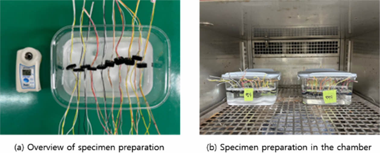 Fig. 3에는 일반수 침수 및 염수 침수에 14사이클 노출된 케이블이 장착된 풀 아웃 시편의 준비 및 노출 과정이 나타나 있다. 염수 환경은 실제 염수를 모사하기 위해 5% 염수가 적용되었으며, 이는 해양 환경이나 고염도 지역에서의 상황을 모사한 것이다. 또한, 시편을 승온 및 감온하는 경우 온도 변화율은 1oC/min으로 설정하였다. 이러한 온도 변화 속도는 접착제가 온도 변화에 따라 받는 응력의 균일성을 보장하며, 접착제의 열분석적 특성을 평가하는데 적합한 조건이다. 이 과정을 통해 각 환경 조건에서 접착제의 접착 강도 및 성능 변화 메커니즘, 그리고 열화를 조사하였다.