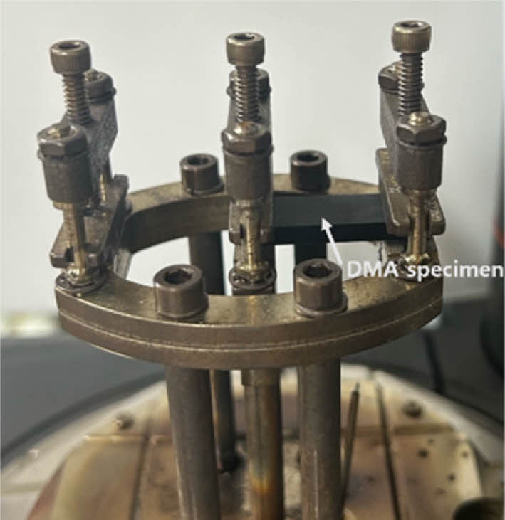 케이블이 장착된 풀 아웃 시편에 사용된 접착제의 열분석 특성을 평가하기 위해 동적 기계적 분석기(DMA, Q800, TA Instruments, USA)을 적용하여 유리전이온도를 측정하였다. 유리전이온도는 접착제의 기계적 성능과 열분석 특성을 평가하기 위한 중요한 지표로, 접착제가 운용 환경에서의 온도 변화에 어떻게 반응하는지에 대한 중요한 정보를 제공한다.
