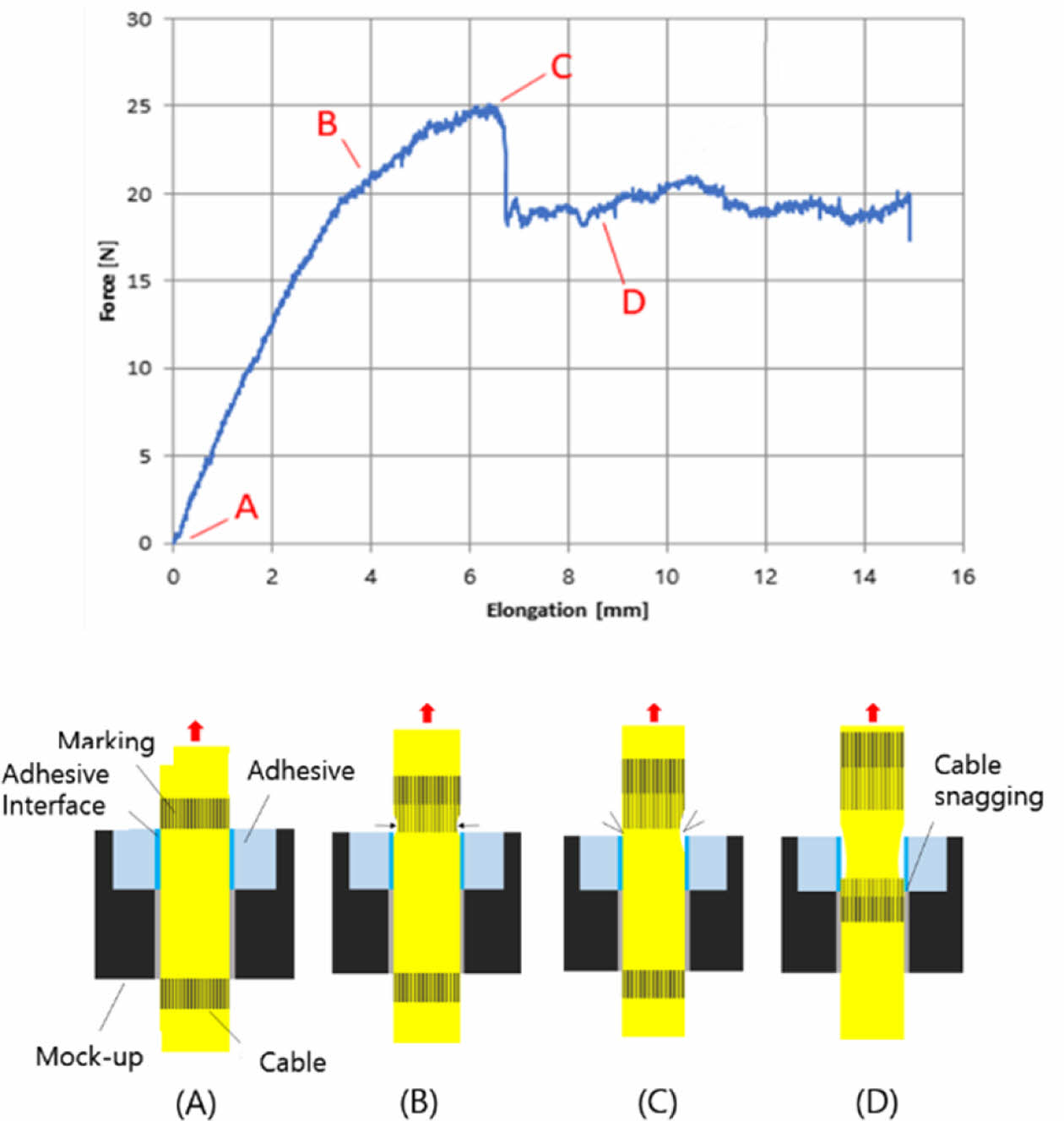 Fig. 7에는 케이블이 장착된 풀 아웃 시편의 전형적인 하중-변위 선도가 나타나 있다. 이는 접착제의 기계적 성능 및 케이블과 접착부 간의 상호작용을 체계적으로 분석하는 데 중요한 역할을 한다. 선도의 각 지점은 케이블의 변형 및 파손 과정으로, 접착 성능 및 파괴 메커니즘과 밀접한 관계가 있다. (A) 지점은 하중이 작용하기 전의 초기 상태로, 케이블과 접착제 간의 접합부가 아직 외부 하중을 받지 않은 상태이다. (B) 지점은 작용하중으로 인해 시편 상부의 케이블 마킹 부위에서 네킹(necking)이 발생하기 시작하는 지점으로, 이 지점에서 케이블의 국부적인 단면적 감소가 나타나며 케이블이 구조적으로 약해지기 시작한다. (C) 지점은 접착부 디본딩(debonding)으로 인해 케이블이 풀 아웃되기 시작하는 지점으로, 접착제와 케이블 간의 결합이 파괴되어 케이블은 접착부로부터 분리된다. (D) 지점은 케이블의 부풀림(swelling)으로 인해 케이블 삽입 구멍과 간섭이 발생하는 지점으로, 케이블과 삽입 구멍 사이의 마찰이 증가하며, 풀 아웃 과정에서 추가적인 저항이 발생한다. 케이블의 주요 파손 양상은 작용하중에 의해 발생한 네킹 현상으로, 일단 네킹이 발생하면 케이블은 풀 아웃된다.