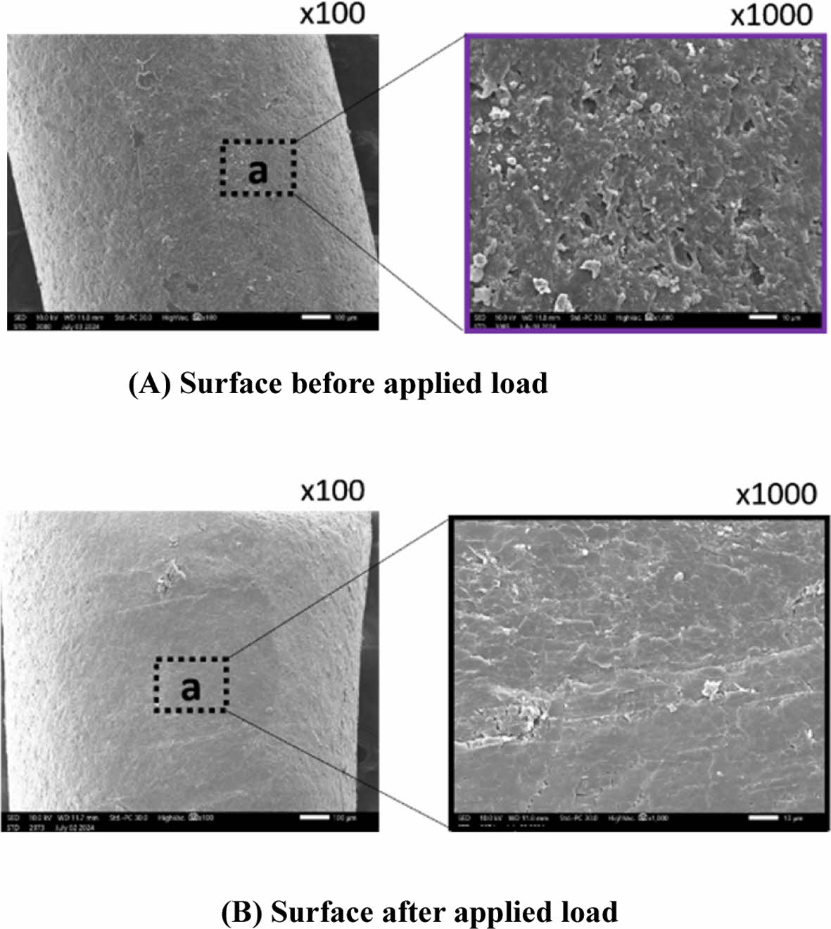 Fig. 8 Cable surface observed from FE-SEM without or with applied load |