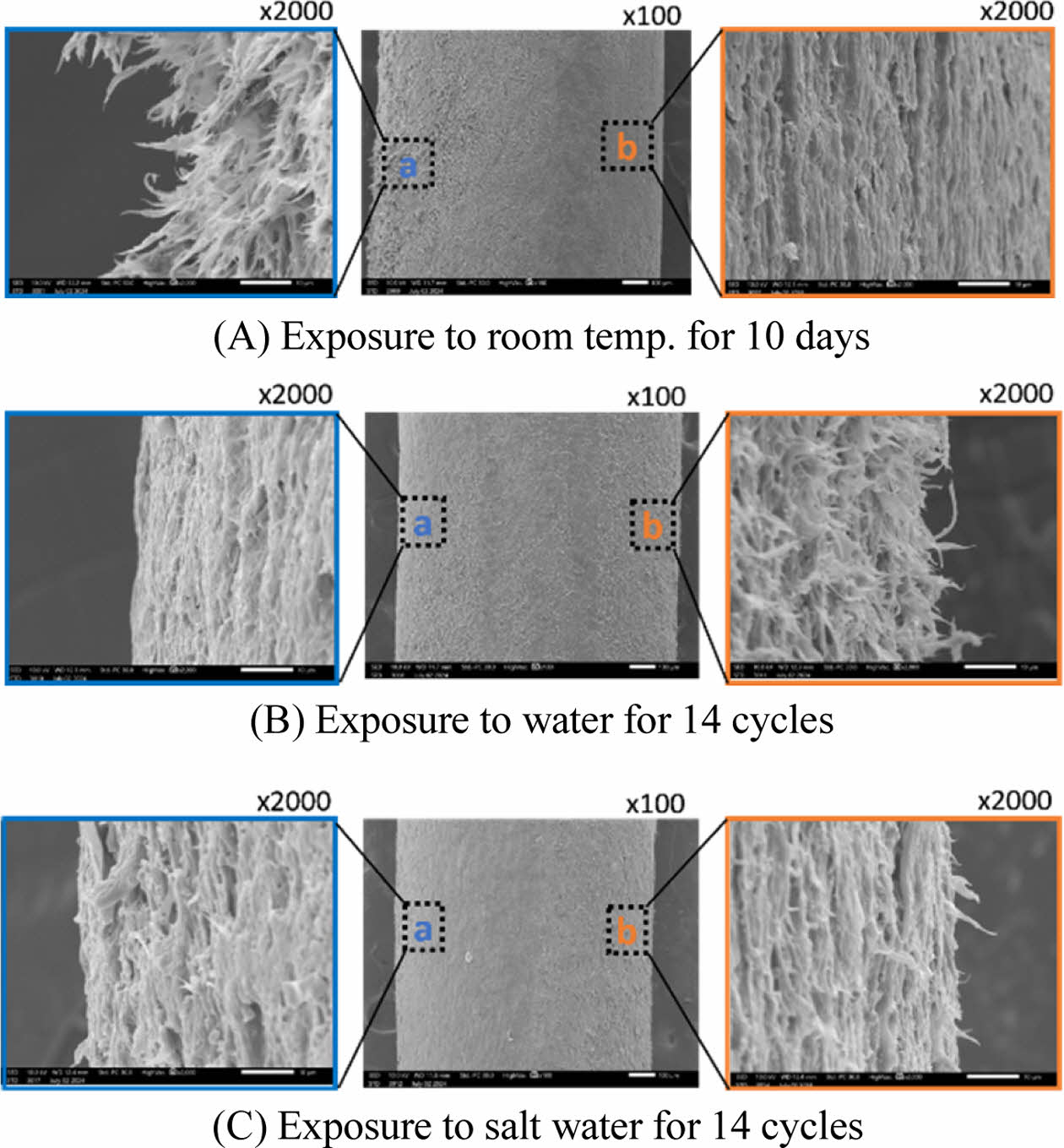 (A)에 나타난 25oC 대기에 노출된 케이블 표면 상태는 (B)에 나타난 일반수 침수와 (C)에 나타나 염수 침수된 경우보다 더욱 거칠게 나타났다. 이는 25oC 대기에서 접착부의 결합 상태가 상대적으로 우수했음을 의미한다. 반면, (C)에 나타나 염수 침수된 케이블 표면 상태는 일반수 침수된 경우에 비해 상대적으로 매끄럽게 나타나, 파손 하중의 차이는 크지 않지만 Table 2에 나타난 파손 하중의 차이를 입증하는 자료로 활용할 수 있다.