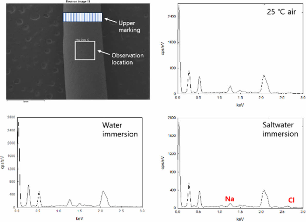 그러나, 염수 침수된 시편에서는 Na(나트륨)와 Cl(염소)이 EDS 분석을 통해 검출되어 접착부 표면에 염수 성분이 침투했음을 알 수 있었다. 염수 침수된 시편의 EDS 피크는 25oC 대기 및 일반수 침수에 노출된 경우와 유사하였으나, 염수 성분이 추가적으로 검출되었다는 점에서 접착부 표면이 염수 영향을 받았음이 확인되었다.
