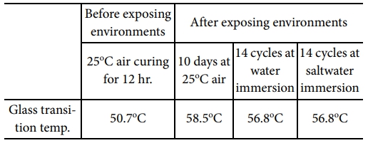 환경 조건 노출 전의 유리전이온도는 50.7oC로 나타났으며, 25oC 대기에서 10일 동안 노출된 경우 58.5oC로 증가하였다. 또한, 일반수 침수에서 14사이클 노출된 경우 유리전이온도는 56.8oC로 측정되었으며, 염수 침수에서 14사이클 노출된 경우에도 동일하게 56.8oC로 나타났다.