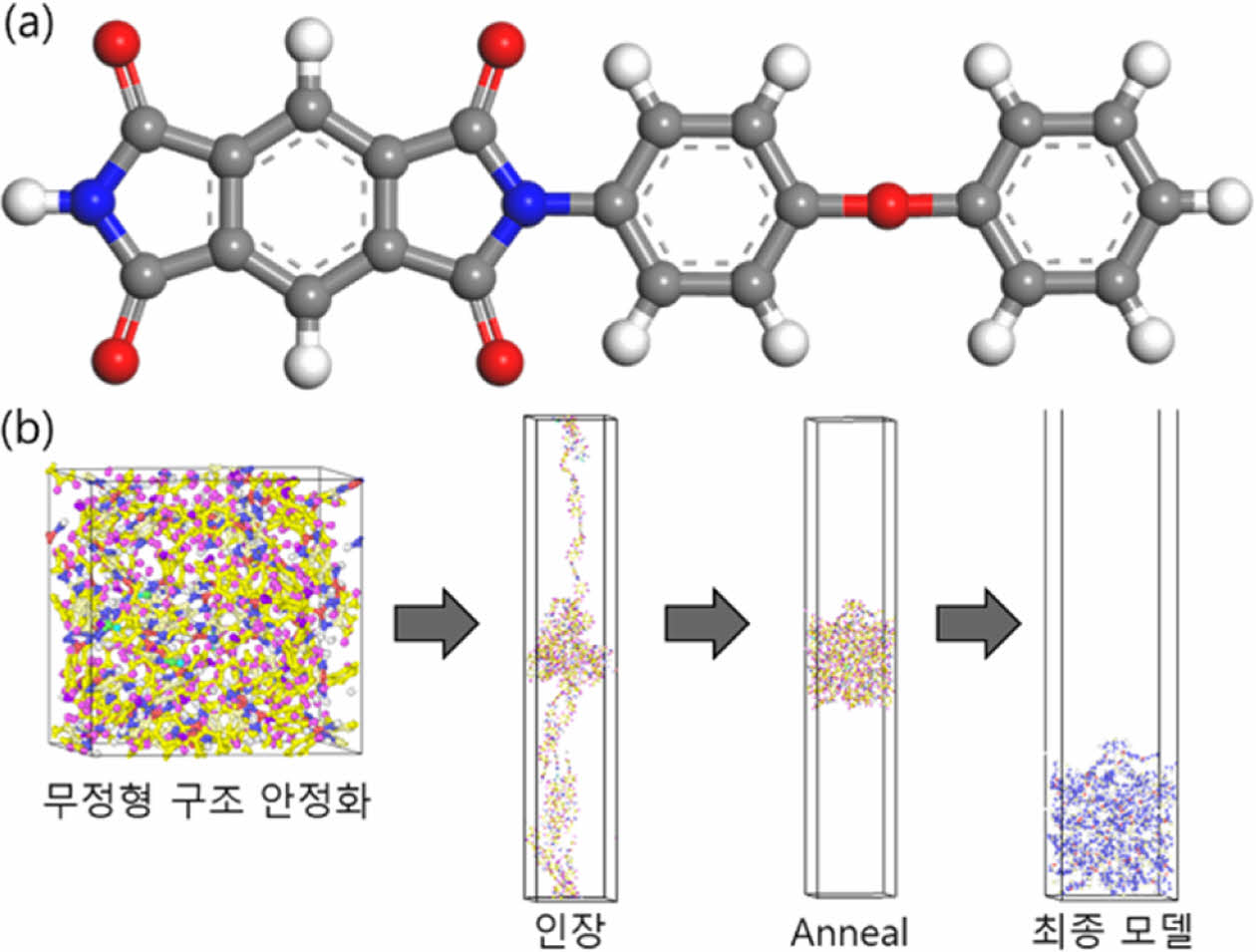 본 연구에서는 polyimide게열의 Kapton 고분자를 대상으로 하였다. Kapton은 뛰어난 열적 안정성과, 전기 차폐 성능, 화학적 안정성, 연신율로 우주공간에서 활용되는 구조체의 coating 소재로 활용된다. 본 소재의 분자동역학 모델링에 사용된 단량체는 Fig. 1(a)와 같이 표현된다. 그림에서 회색 원자는 탄소, 흰색 원자는 수소, 파란색 원자는 질소, 빨간색 원자는 산소 원자를 나타낸다. 초기의 Kapton 고분자의 시뮬레이션 셀에는 10개의 Kapton 단량체가 하나로 결합된 사슬이 4개가 임의로 배치되어 존재한다. 따라서 총 40개의 Kapton 단량체가 존재하며, 총 1568개의 원자가 cell에 포함된다.