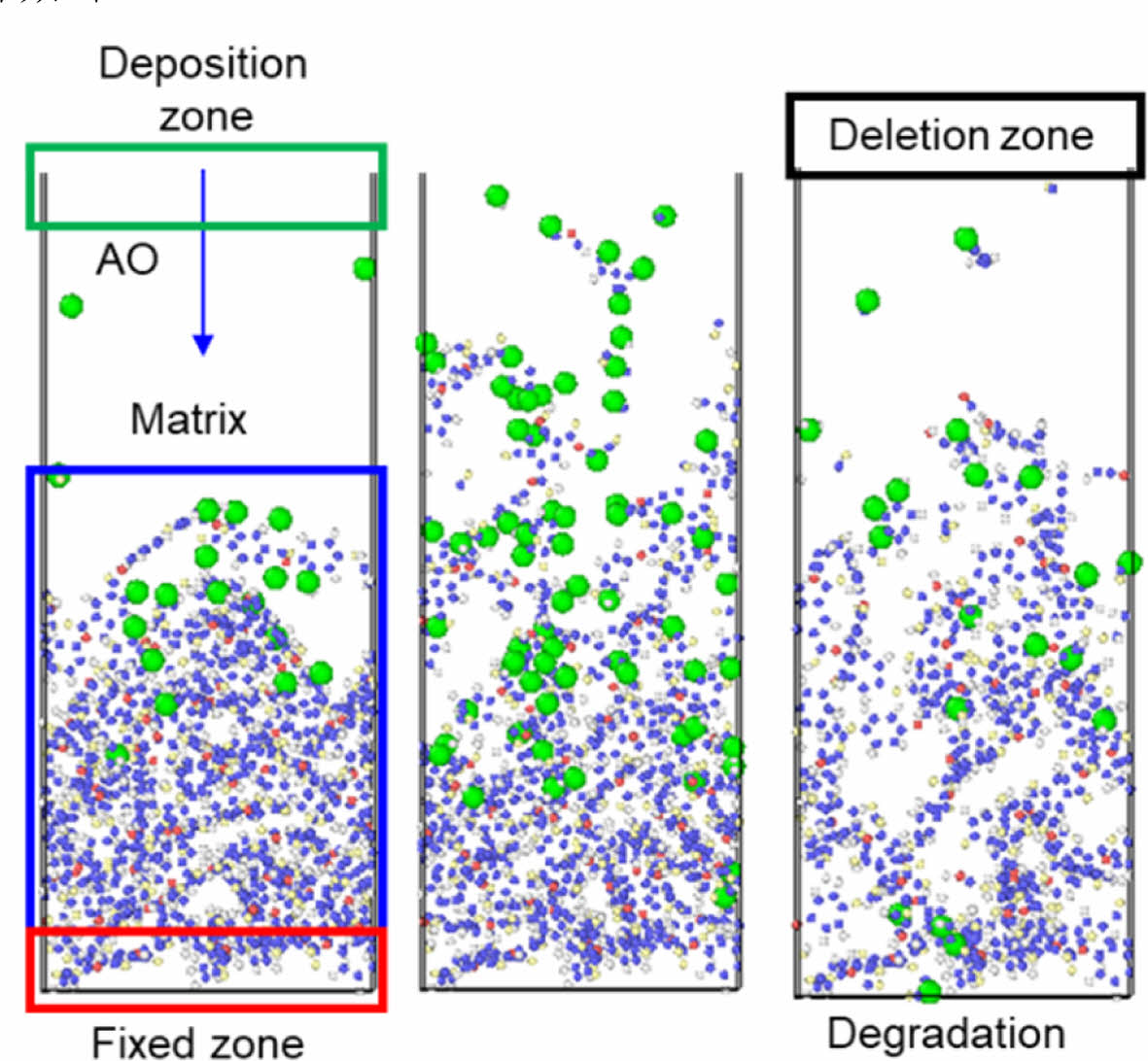 지상 시험 또한 고진공과, 저온과 고온을 오가는 온도의 조절, AO 이온의 조사 등의 환경을 구축하기 위해서는 많은 자원을 소모하기 때문에 분자동역학 전산모사 기법을 통해 AO에 의한 고분자 표면에서 발생하는 현상을 연구하고자 하는 많은 시도들이 존재하였다. 기존의 전통적인 All-atom 분자동역학 포텐셜의 경우 화합 결합이 시뮬레이션 중 고정되어있기 때문에, AO에 의한 산화과정 등을 모사하기 위해서는 화학 결합을 모사할 수 있는 Reax-FF를 활용하는 것이 필요하다. Reax-FF를 활용한 AO 충돌 해석의 첫 시도는 Rahnamoun et al.[3]에 의해 이루어졌으며, Teflon, Kapton, POSS-Kapton, Silica에 대해 AO 저항성을 비교하였다. 그 후에도 보다 심층적으로 AO에 대한 메커니즘을 조사한 연구[4] 및 다양한 물질에 대한 유사한 연구들이 진행되어왔으며, 고분자 복합소재의 기지로 흔히 사용되는 Epoxy[5,6], Kapton의 그래핀, CNT 등을 포함하는 나노 복합소재, 열방호 소재로 쓰이는 SiC[7]에 대한 연구들이 수행되어왔고, 최근에는 질소 분자와의 충돌에 의한 효과 또한 조사되었다[8].