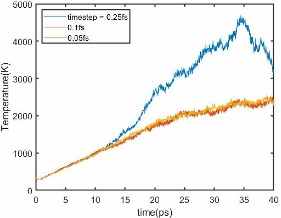 통상적인 분자동역학 시뮬레이션에서 긴 time step이 길어질 경우 적은 계산량으로 해석을 수행할 수 있지만, 정확성에 손실을 갖는다. Reax-FF의 경우 특히 원자의 반응성에 영향을 줄 수 있어 time step의 결과에 대한 영향이 더욱 크게 나타한다. 따라서 적절한 time step을 선택하기 위해 다른 조건은 모두 동일하게 설정한 상태에서 0.25 fs, 0.1 fs, 0.05 fs의 time step으로 NVE 해석을 수행하였다.
