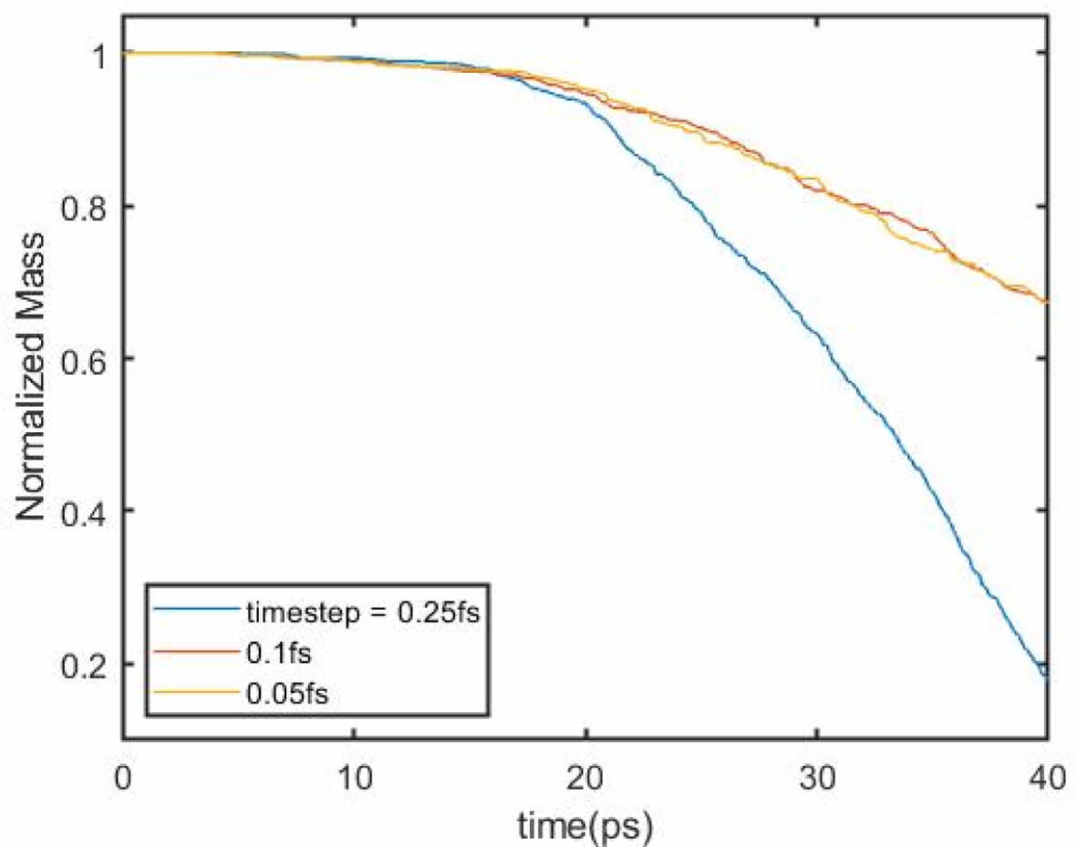 각 time step별 해석 중에 나타난 온도 변화와 slab의 질량 변화는 각각 Fig. 3과 Fig. 4에 표시되어 있다. 그 결과 0.25 fs의 time step 조건에서는 빠른 속도로 3000~4000 K까지 온도가 상승하고, slab의 질량 또한 40 ps동안 거의 모두 증발해 사라졌지만, 0.1 fs와 0.05 fs의 결과에서는 둘의 차이가 거의 없었으며, 온도 또한 완만하게 2000 K 정도까지만 증가하는 것을 확인하였다. 시스템에 에너지가 투입되는 속도는 동일함에도, 이러한 결과 차이가 보여진 것에 대해, 이는 0.25 fs의 time step 조건에서 화학 반응이 더욱 빨리 일어나는 현상이 반영된 것으로 보인다. 이러한 현상은 같은 속도를 갖는 원자가 있을 때 긴 time step에서 한번에 더 많은 변위를 움직일 수 있기 때문에, 결합된 원자들이 결합 거리 바깥으로 움직일 가능성이 더 높기 때문으로 해석할 수 있다. 따라서, 본 연구에서는 결과가 수렴하여 계산된 0.1 fs의 time step을 택하여 해석을 진행하였다.