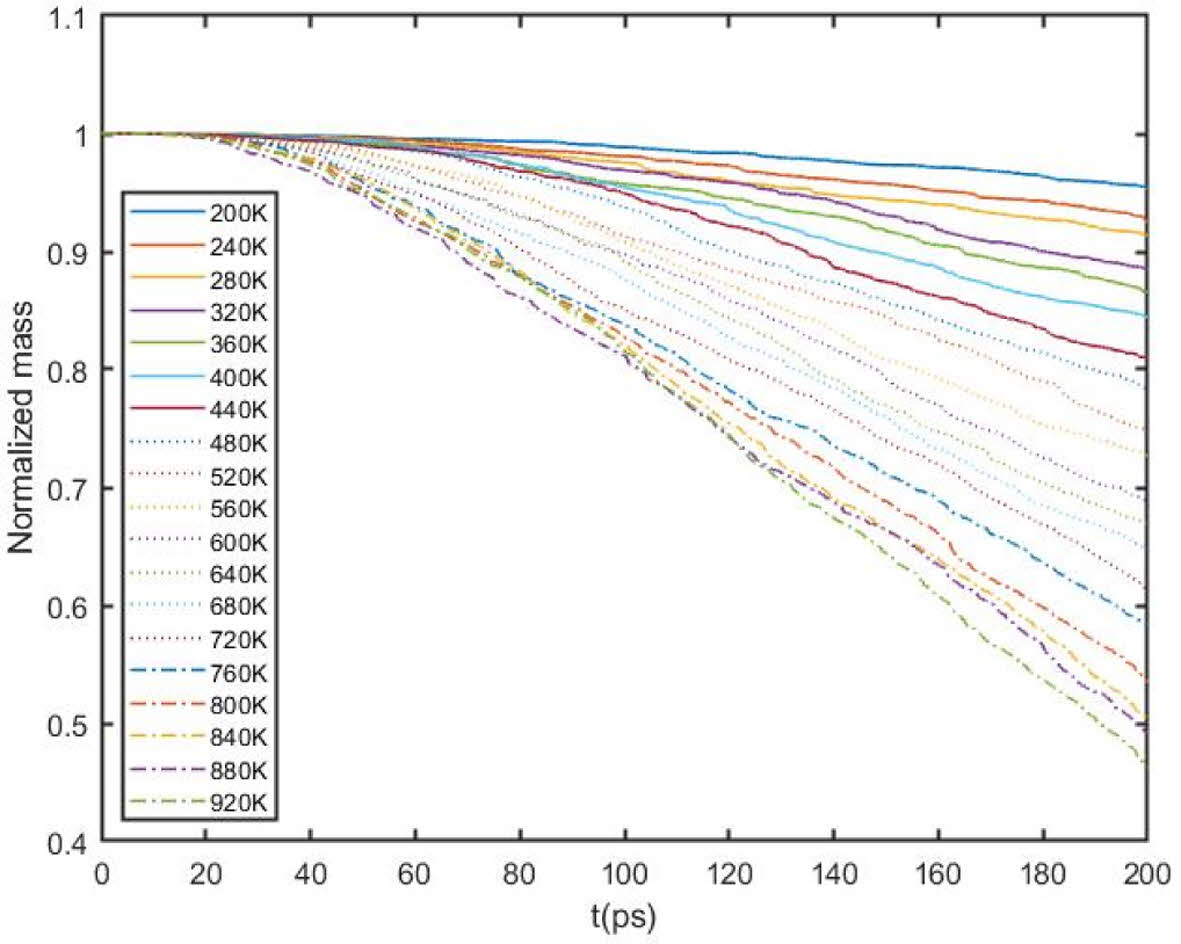 각 온도 조건에서 NVT 해석을 수행한 slab의 정규화된 질량의 결과는 Fig. 5에 표시하였다. 온도가 증가함에 따라 질량이 감소하는 기울기가 증가함을 확인할 수 있으며, 초기에는 비선형으로 질량이 감소하다가 본격적으로 기체가 발생하여 질량 감소가 발생하는 때부터는 선형으로 질량이 감소하는 현상 또한 확인하였다. 기존 문헌과 달리 긴 시간의 해석으로부터 선형의 질량 감소 구간을 관측하였고, 기울기가 수렴한 선형 구간에서의 질량 감소율을 계산함으로써 보다 정확한 AO 침식 수율 값을 구해 정량화에 활용하였다.
