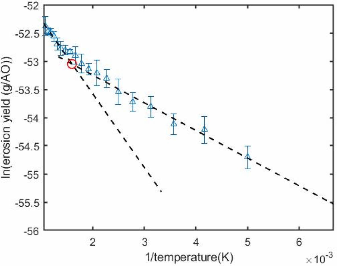 Fig. 5에서의 선형 질량 감소 구간에서의 기울기로 구한 온도에 따른 침식 수율은 Fig. 7과 같이 그려진다. 침식 수율의 로그 값과 온도의 역수에 대한 Arrhenius식 (3)의 관계로 plot하였으며, 그 결과 두 구간에서 선형인 bilinear 커브로 그려졌다. 초기에 낮은 기울기로 그래프가 그려지다가 특정 온도를 기점으로 기울기가 높아지게 되며, AO에 의한 반응이 가속되는 것을 확인할 수 있다. 이는 AO 충돌에 의한 화학 반응 양상에서 온도에 의해 상 변화가 일어났음을 의미한다.