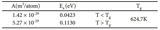 각 bilinear curve들을 외삽하여 교점을 구할 경우 이 상 변화 온도 점을 구할 수 있는데, 그 결과 624.8 K의 온도에서 상 변화가 일어났음을 확인하였으며, 이는 실험적으로 알려진 Kapton의 유리전이 온도인 360~410°C의 범위와 일치한다[14]. 이러한 현상은 유리전이 온도 이상에서 고분자에 포함된 원자들의 유동성이 크게 증가하고, 그에 따라 Kapton을 구성하는 구조적 탄소 원자들이 보다 쉽게 구조로부터 떨어져 나가 기체로 발생하기 쉽기 때문으로 보여진다. 피팅된 온도에 따른 함수식의 형태와 값들은 Table 1에 표시되었다. Fig. 6