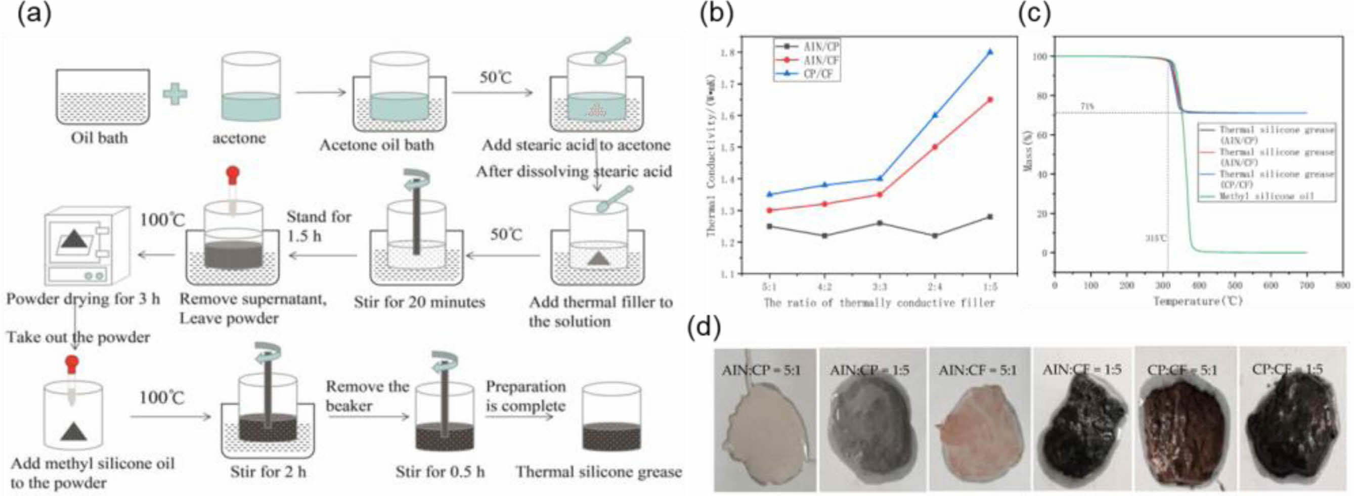 Fig. 1 (a) Schematic describing preparation procedure of thermal pastes. (b) Thermal conductivity of thermal pastes with different compositions. (c) TGA curve of thermal pastes and silicone oil. (d) Photographs of oil separation after heating thermal pastes. [23] |