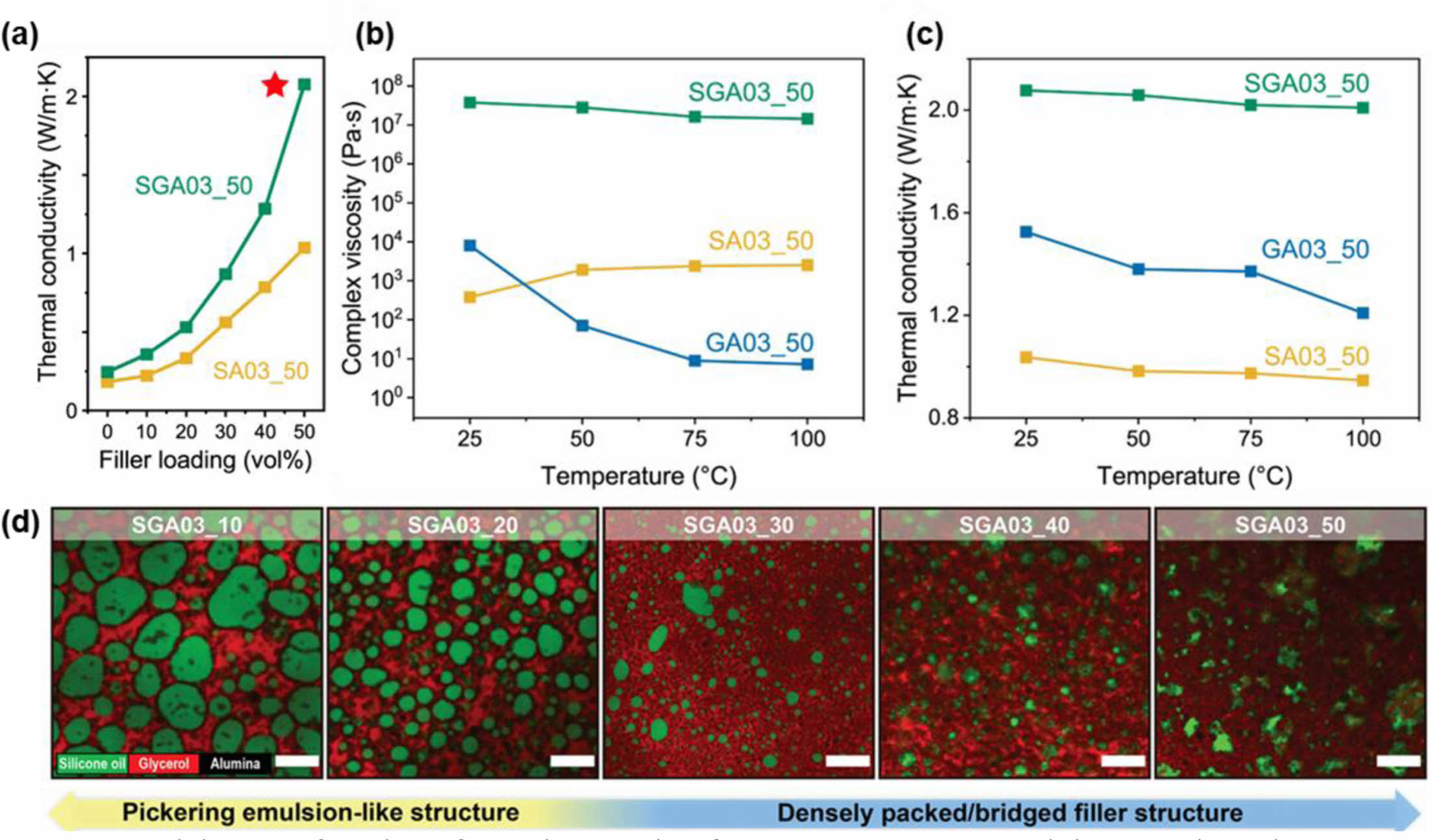 Fig. 2 (a) Thermal conductivity as a function of alumina loading for thermal pastes containing alumina with an average diameter of 3 μm (SA03, GA03, and SGA03). (b) Complex viscosity at an angular frequency of 0.1 rad/s, (c) TC of SA03_50, GA03_50, SGA03_50. (d) Confocal micrographs of SGA03 with filler loadings ranging from 10 to 50 vol%. Here, SA and GA denote the suspension-type thermal paste composed of silicone oil/alumina and glycerol/alumina, while SGA represents the emulsion-type thermal paste composed of a mixture of silicone oil/glycerol in a1:1 volume ratio and alumina microparticles. The numerical suffixes appended to the sample labels indicate the average diameter of the alumina used (3 µm). [26] |