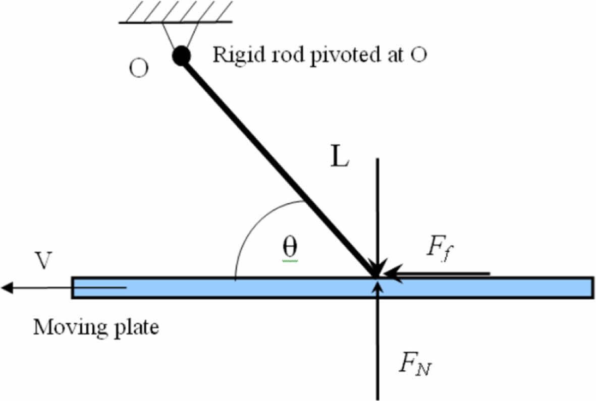 식 (1)은 마찰력(Ff)이 두 선이 만나는 각도(q)에 따른 마찰계수(m)의 관계를 나타내고 있으며 식 (2)는 마찰력에 따른 수직항력(Fn)관계를 나타낸다. 위 식에서 마찰계수가 m = cot(θ)인 경우 마찰력은 무한대가 되는데 이 경우를 스프래깅(Spragging)이라고 한다[13]. 스프래깅 조건이 만족되면 막대 끝이 움직이는 판의 반대방향으로 튀어 나가면서 판과 막대 사이의 상대적인 운동이 무한히 지속된다.