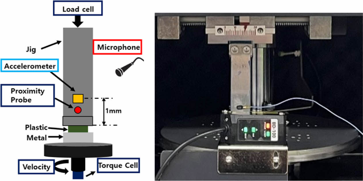 Fig. 3은 장비에 부착된 센서의 종류 및 위치를 나타내고 있다. 로드셀, 토크센서, 근접 프로브, 가속도계 그리고 마이크까지 5개의 센서가 부착되었다. 위 센서들은 접촉된 두 소재가 마찰 운동을 진행함에 따라 각 물리량(토크, 가속도, 변위, 음압 등)을 실시간으로 측정하여 데이터를 저장하였다.