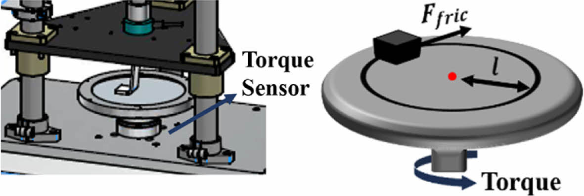 Fig. 4는 토크센서의 위치와 토크센서로부터 측정된 값으로 마찰력을 계산하는 방법에 대해 도식적으로 표현한 것이다. 토크센서는 디스크의 하단부에 위치하며 식 (3)을 이용하여 계산하였다. 이때 l은 웜기어를 이용하여 거리를 조절할 수 있는데 위 연구에서는 l = 20 mm로 시험을 진행하였다.