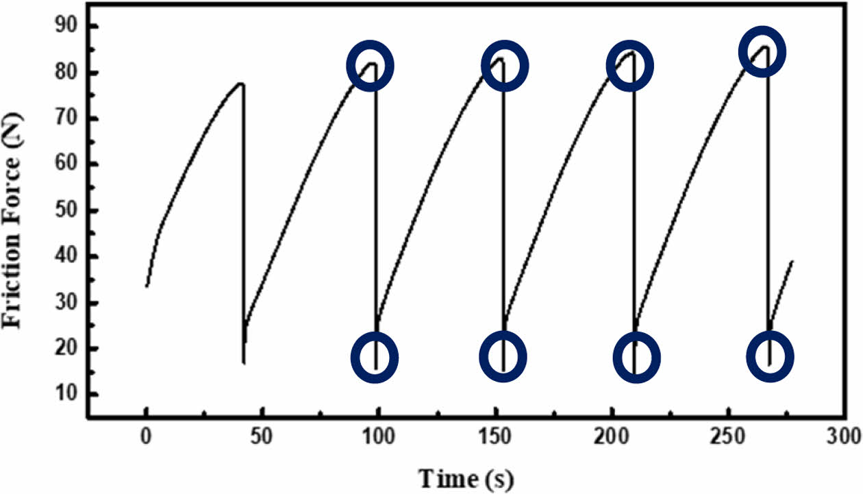 동일 시험을 연속으로 진행하였을 때의 마찰계수의 변화가 Fig. 7과 같이 나타났다. 정마찰계수는 0.30에서 0.27로 10% 이내에서 형성되는 것을 알 수 있으며, 로컬 최댓값과 최솟값의 진폭의 재현성은 20%로 나타났다.