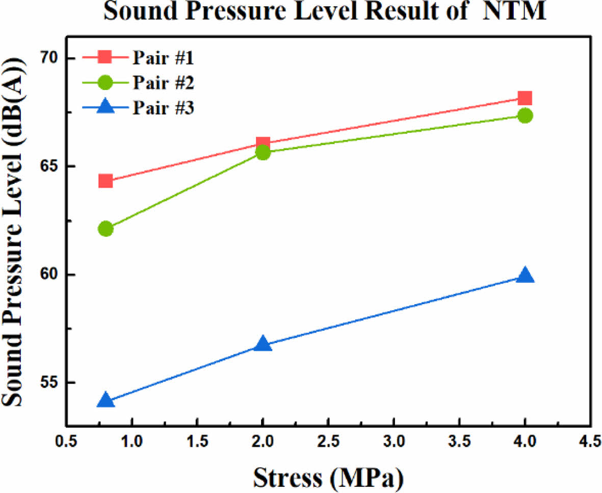 3개의 접합쌍이 0.8 MPa 부터 4 MPa까지 3가지 응력 조건으로 변화하였을 때 이음 발생의 변화에 대한 결과가 Fig. 6에 나와 있다. Pair #1 부터 Pair #3까지 모든 시험 조건에서 일정한 경향성을 가지고 있는 것을 확인하였다. 또한 실제 차량에서 발생하고 있는 이음 현상이 구축된 장비에서도 유사한 결과가 나오는 것을 확인하였다.