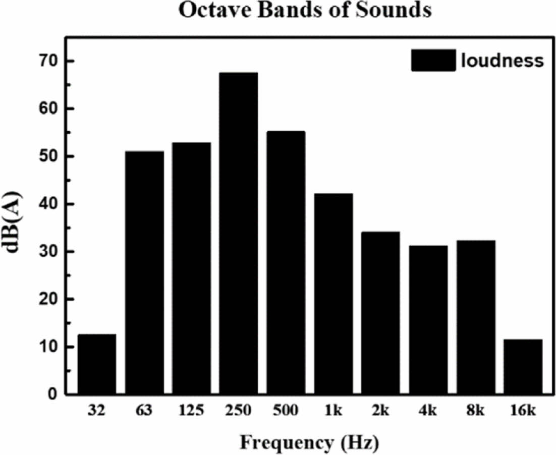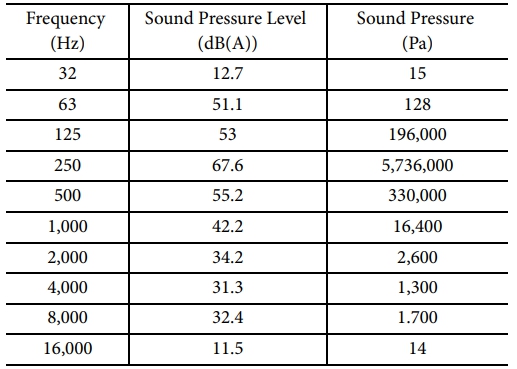 구성 주파수의 양을 Pa로 나타내면 Table 7과 같이 나타난다. Table 7에 따르면 대부분의 음압이 250 Hz에 모여 있는 것을 알 수 있다. 이는 모든 시험 조건에서 동일한 경향을 보인다.
