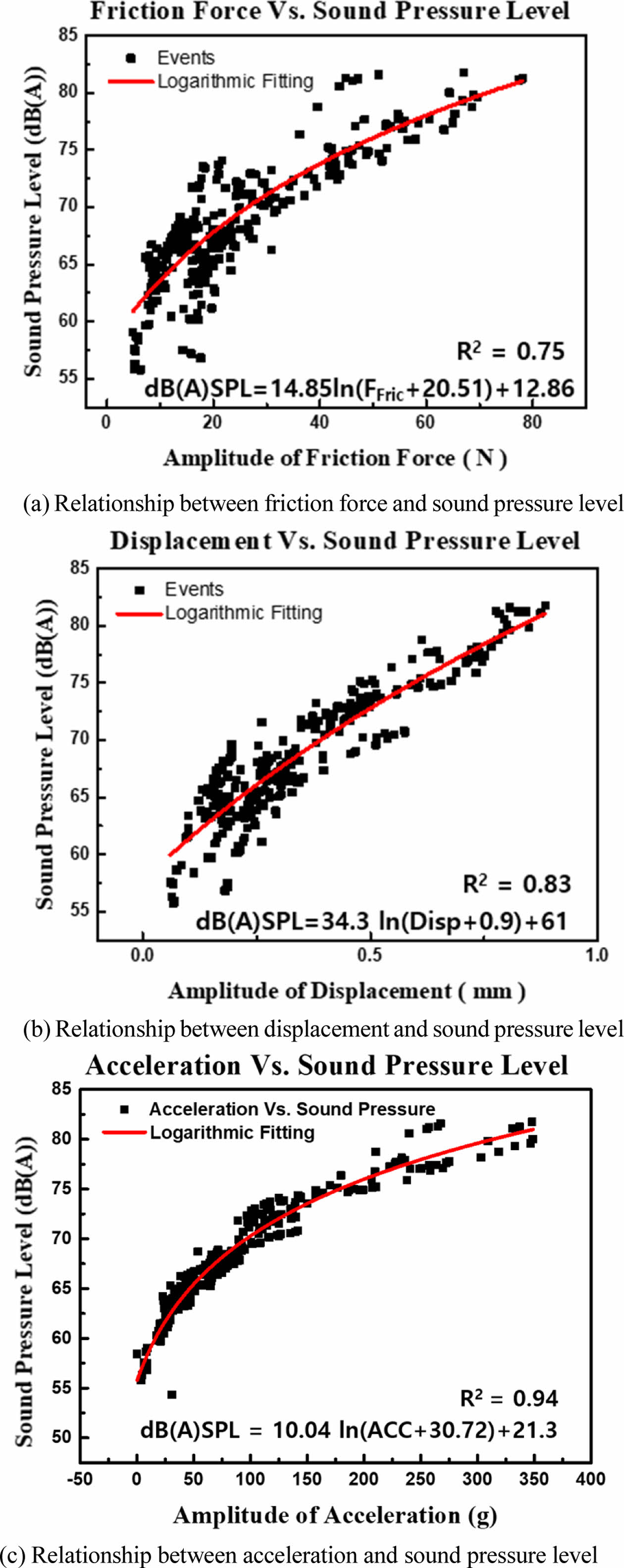 Fig. 9에 마찰 물리 량과 이음의 크기와의 상관관계를 나타내었다. 각 물리 량은 음압과 최소 R2 = 0.75 이상의 로그관계를 가지고 있는 것이 확인되었으며, 이중 가속도와 이음이 R2 = 0.94로 높은 연관성을 보였다. 이는 마이크가 주변 소음으로 인해 측정이 잘 되지 않더라도 마찰 이벤트의 가속도 값을 안다면 어느 크기의 이음이 발생하는지 예측할 수 있어 가속도계를 이용한 이음예측이 가능함을 확인하였다. Table 6