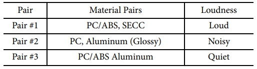 접합쌍의 경우 기존 Table 2에서 사용했던 3개의 접합쌍 중 가장 큰 소음을 유발했던 첫번째 조합을 선정하여 시험을 진행하였다.