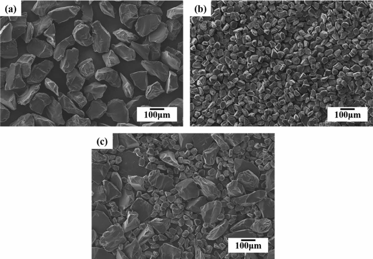 본 연구에서 알루미늄 복합재료의 기지재는 Al1100 (99.99% Komajawa metal, Japan)를 사용하였으며 강화재로는 B4C (Dunhua Zhengxing Abrasive Co., Ltd., Dunhua, China) 분말과 cBN (ILJIN Diamond, Korea) 분말을 사용하였다. 레이저 회절분석기(Sympatech HELOS, Clausthal-Zellerfeld, Germany)를 이용하여 분말의 평균 입도 크기를 분석한 결과 각각 100 μm, 50 μm 크기인 것을 확인하였다. B4C, cBN 강화재를 20:5 부피비로 준비한 뒤 3차원 믹서기를 이용하여 SUS 볼과 함께 넣어 1시간 동안 혼합하였다. Fig. 1(a), (b)는 B4C와 cBN 분말이며, (c)는 혼합 분말의 SEM 이미지이다.